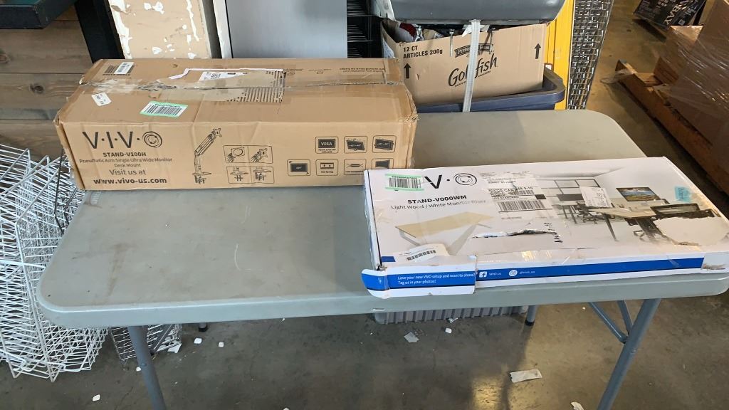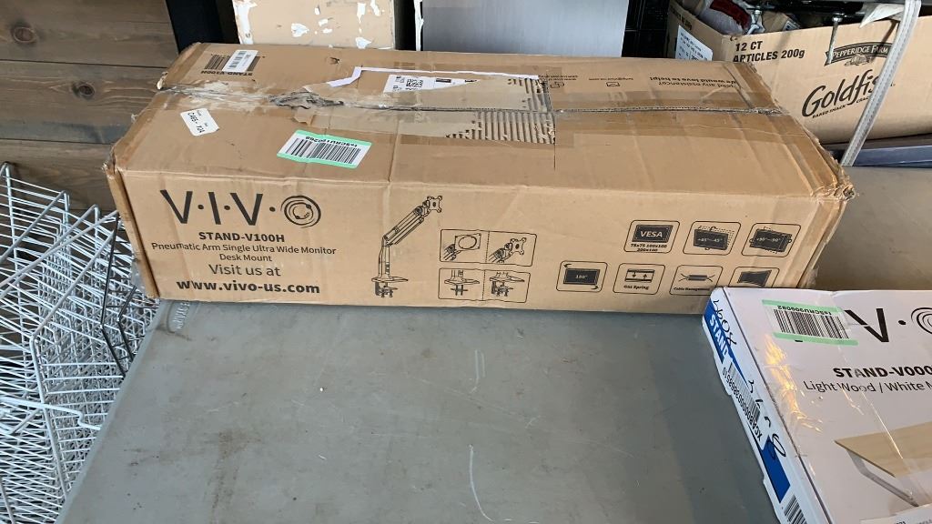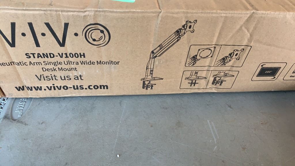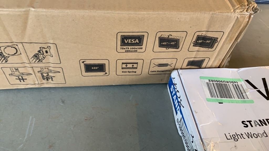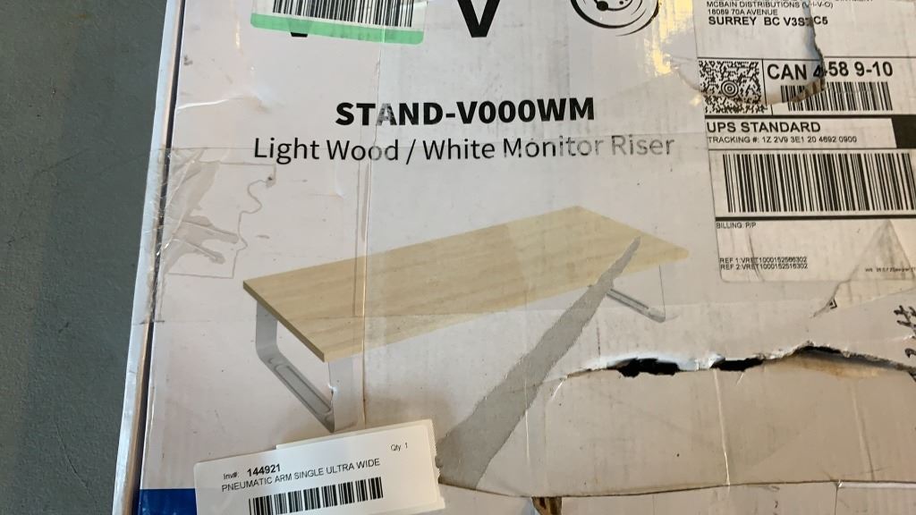 PNEUMATIC ARM SINGLE ULTRA WIDE MONITOR DESK MOUNT AND LIGHT WOOD/WHITE MONITOR RISER
