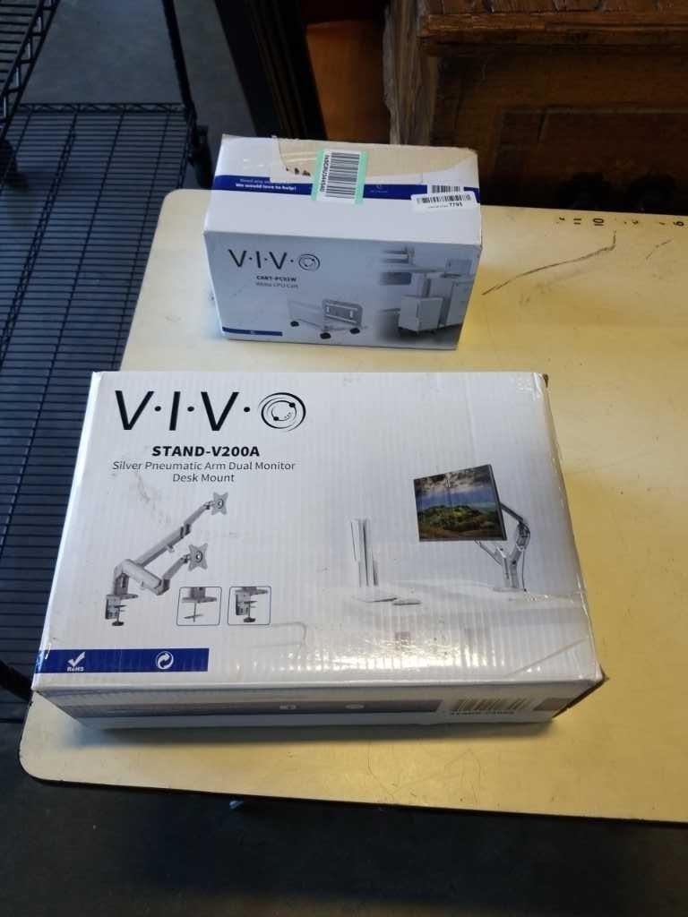 PNEUMATIC DUAL ARM MONITOR DESK MOUNT AND WHITE CPU CART