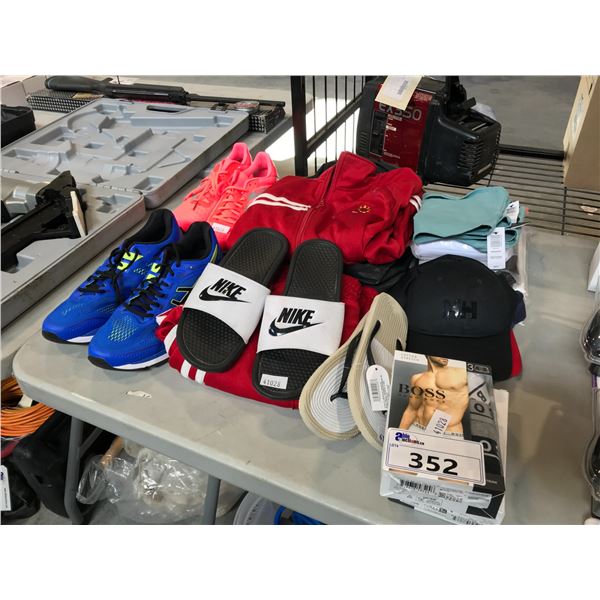 LOT OF ASSORTED MEN'S CLOTHING INCLUDING NIKE SLIDES, SUPREME HAT AND RED TRACK SUIT