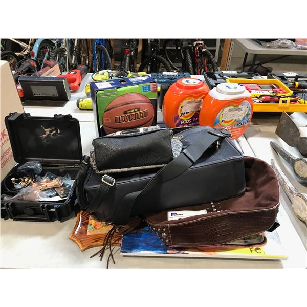 LOT OF ASSORTED HAND BAGS, TATTOO KIT, 2 CONTAINERS OF TIDE PODS, BASKET BALL AND ASSORTED ARTWORK