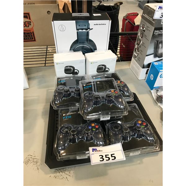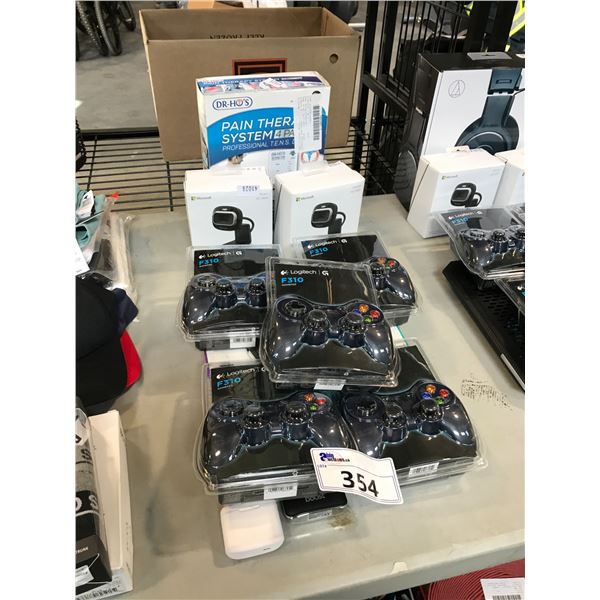 5 LOGITECH PC CONTROLLERS, 2 MICROSOFT LIFECAM HD-300 MONITOR MOUNTED CAMERA, DR-HO'S PAIN THERAPY SYSTEM, EARPHONES, LOGITECH TABLET KEYBOARD A...