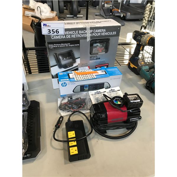 VEHICLE BACK-UP CAMERA SYSTEM WITH 3.5" COLOUR DISPLAY, HP F730X MIRROR MOUNTED CAR CAMCORDER, MOTOMASTER PORTABLE AIR COMPRESSOR, SPARK PLUGS ...