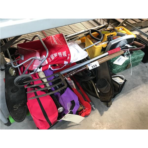 2 TOOL BOXES OF ASSORTED HAND TOOLS, FIREARM CARRY CASE, 3 FOLDING CHAIRS, BUDWEISER MOBILE COOLER BAG, PENNY BOARD AND WALKING CANE