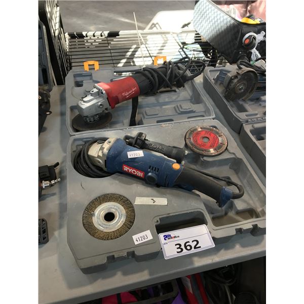 MILWAUKEE 120V GRINDER AND RYOBI 120V GRINDER WITH HARD CARRY CASE AND SPARE GRINDER WHEELS,