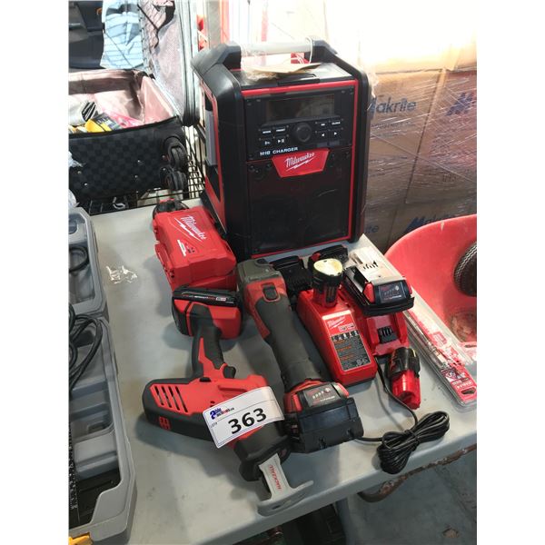 LOT OF ASSORTED MILWAUKEE POWER TOOLS INCLUDING, BLUE TOOTH JOBSITE RADIO/M18 CHARGER, HACKZALL,