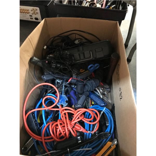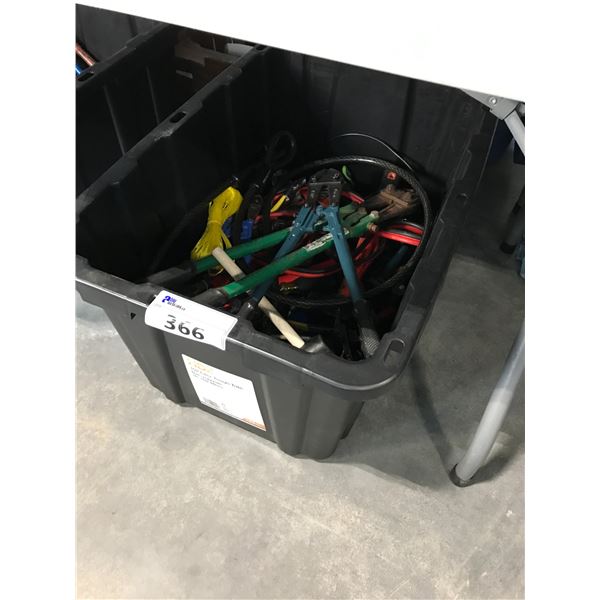 TOOL BOX OF ASSORTED HAND TOOLS, BIN OF ASSORTED HAND TOOLS/KNIVES, INDUSTRIAL HOSE, AND 3 EMPTY