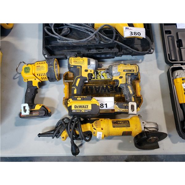 2 DEWALT 20V IMPACT DRIVERS, DEWALT 20V PORTABLE WORK LIGHT, DEWALT 120V GRINDER AND DEWALT RATCHET