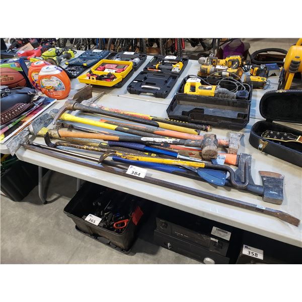 LOT OF ASSORTED HAND TOOLS INCLUDING SLEDGE HAMMER, AXES, PICKAXES AND PRYBARS