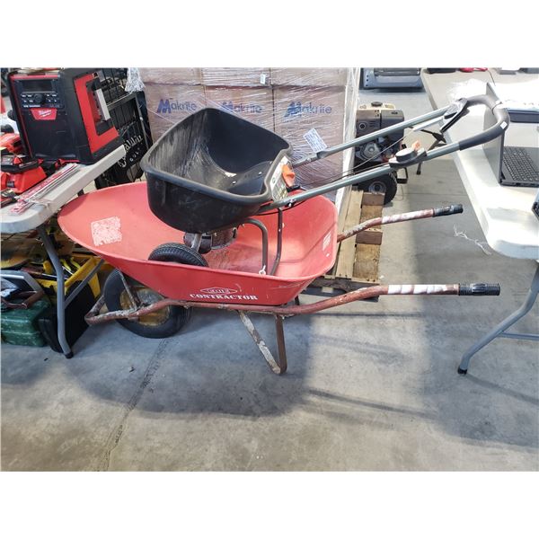RED INDUSTRIAL WHEELBARROW AND SCOTTS TURF BUILDER PRO
