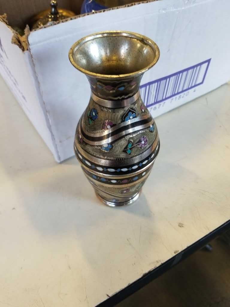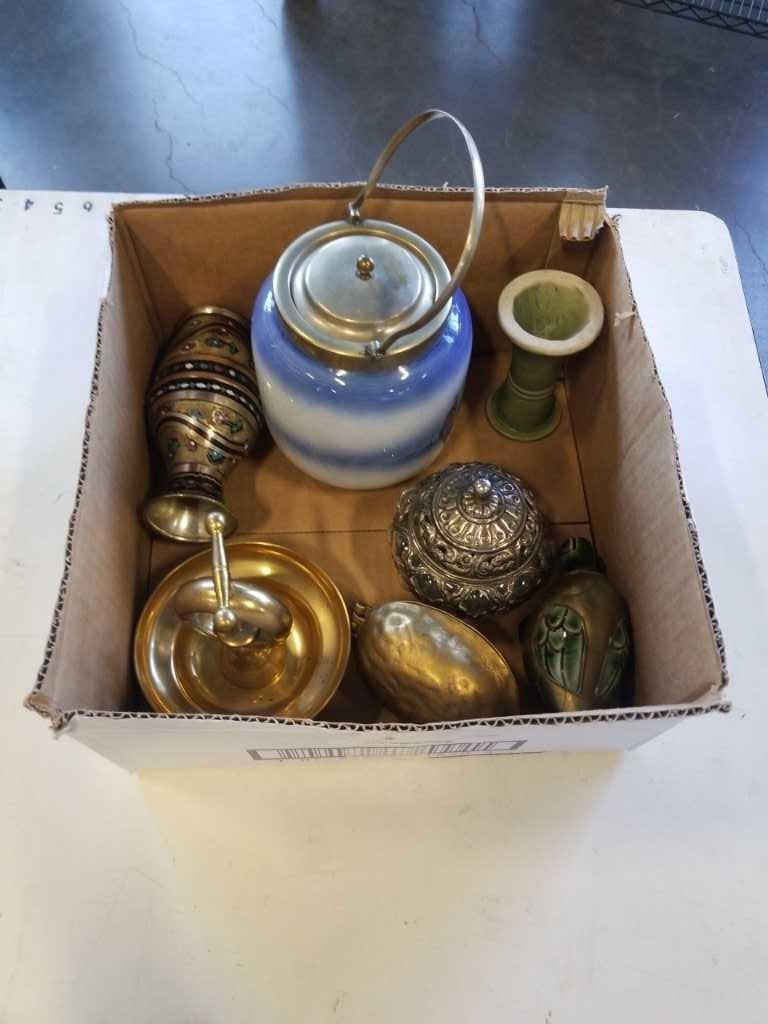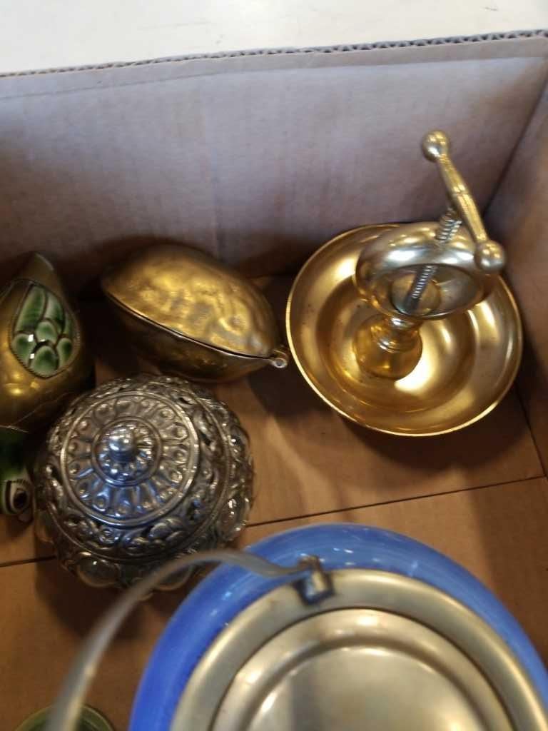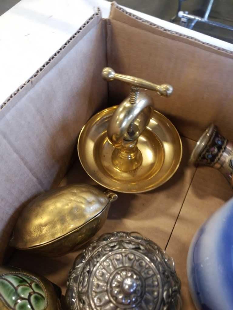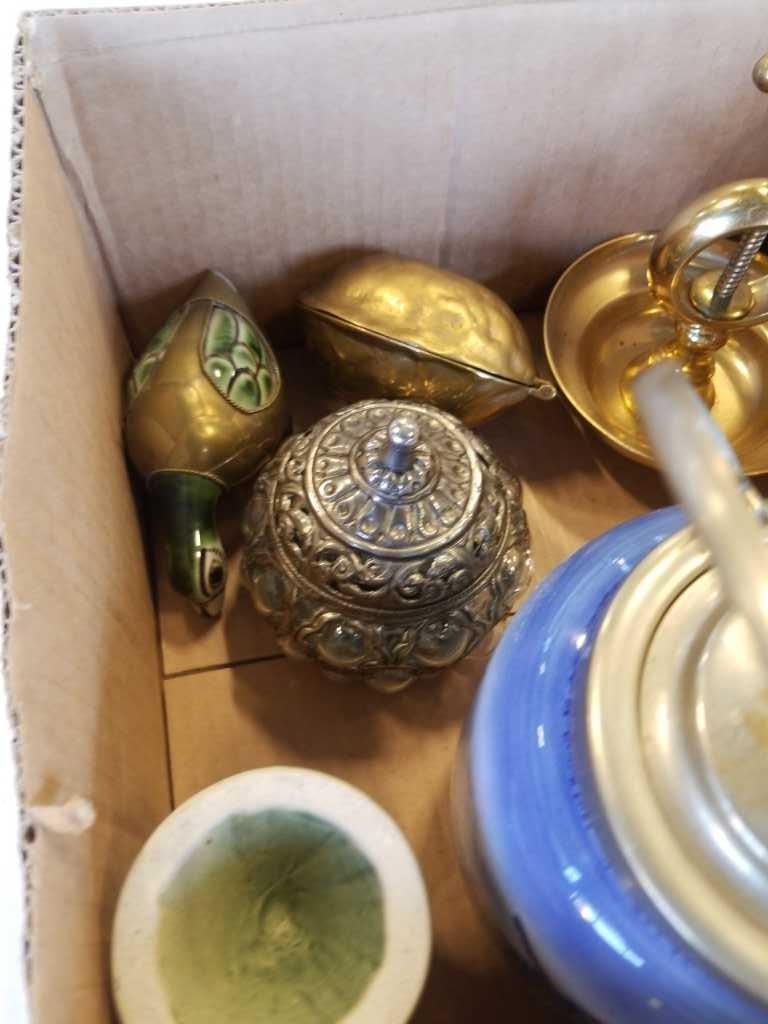 PORCELAIN JAR WITH LIDDED JAR, SMALL PEDESTLE AND BRASS COLLECTIBLES