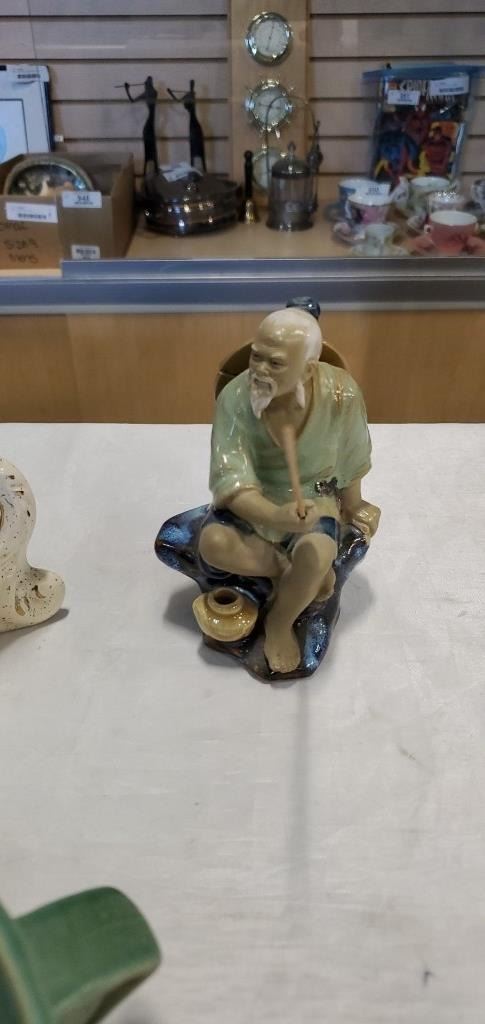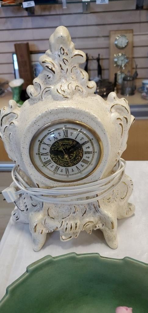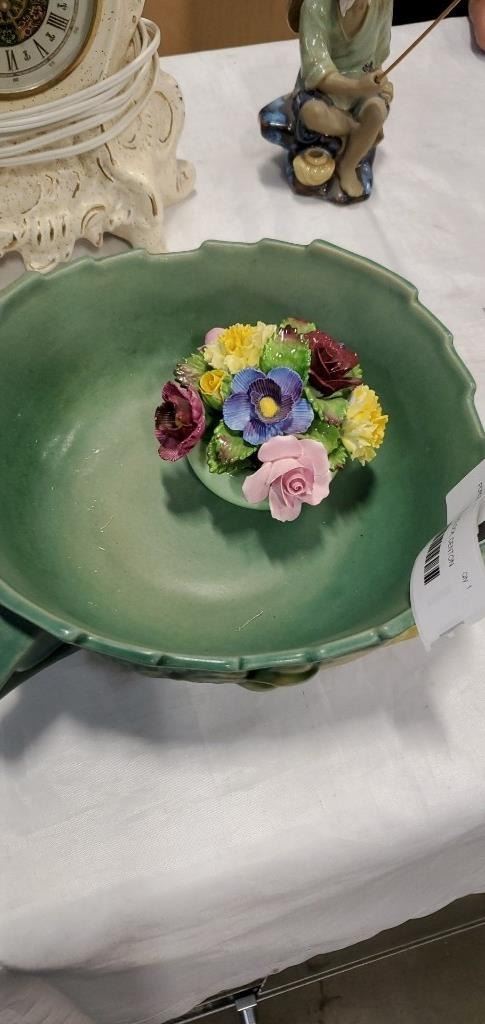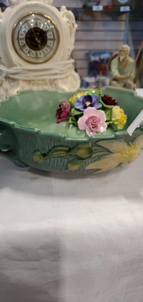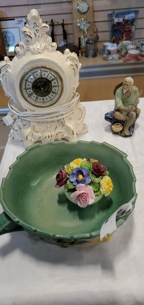 PORCELAIN MANTLE CLOCK, DENTON FLORAL AND ROSEVILLE BOWL - BOWL HAS REPAIRED HANDLE