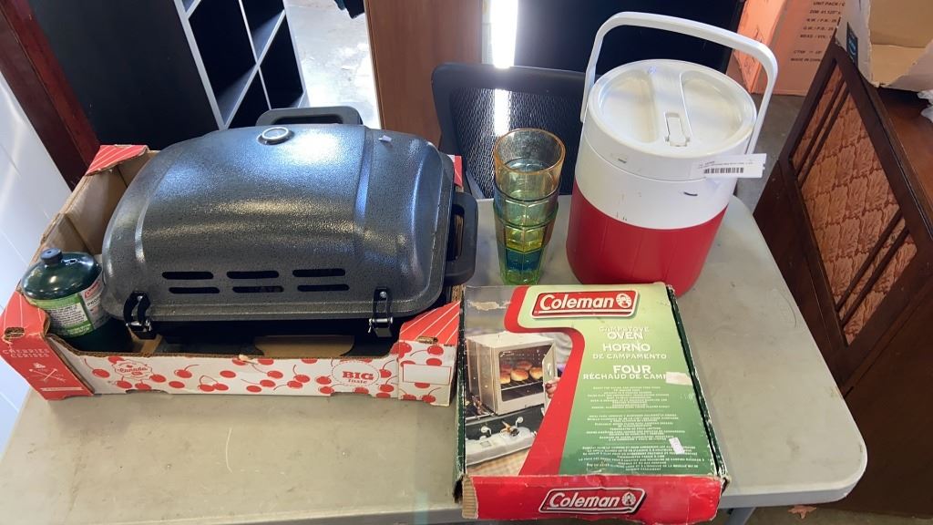 PORTABLE PROPANE BBQ WITH TANK, COLEMAN CAMPSTOVE OVEN AND DRINK DISPENSER WITH 3 CUPS