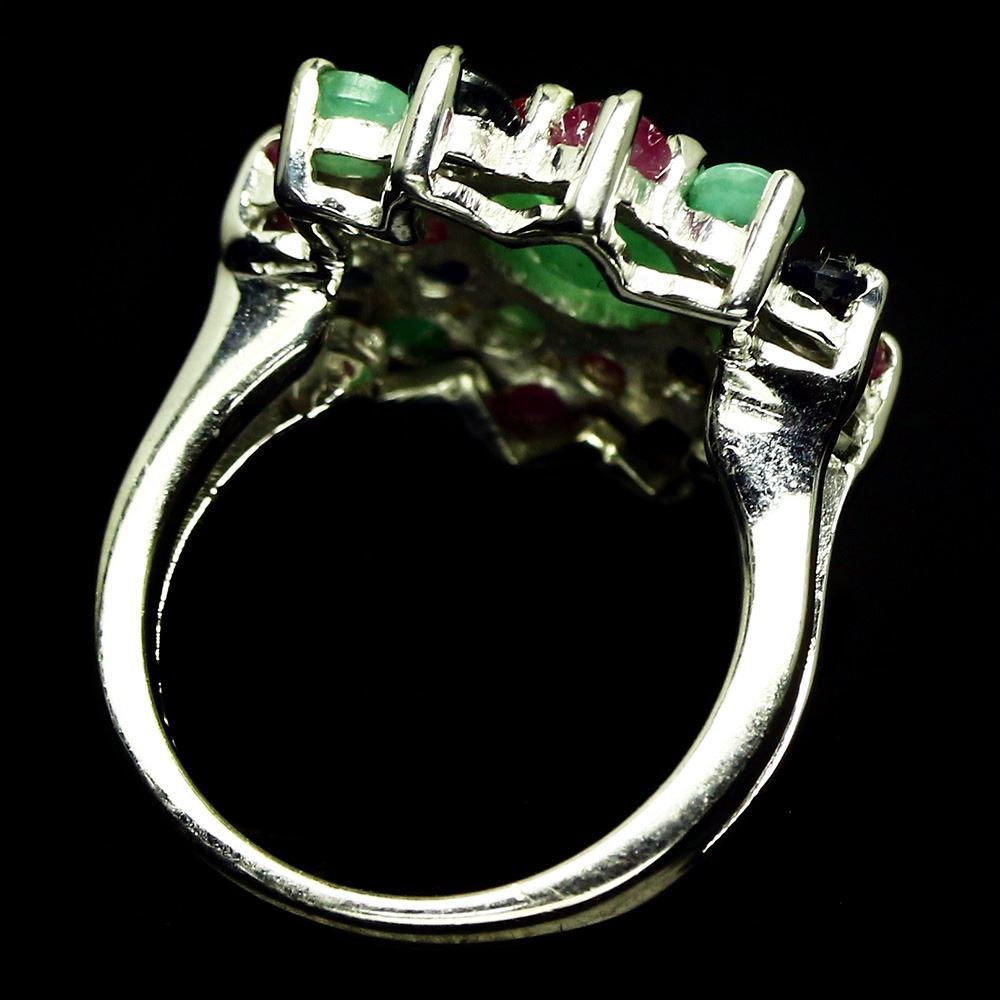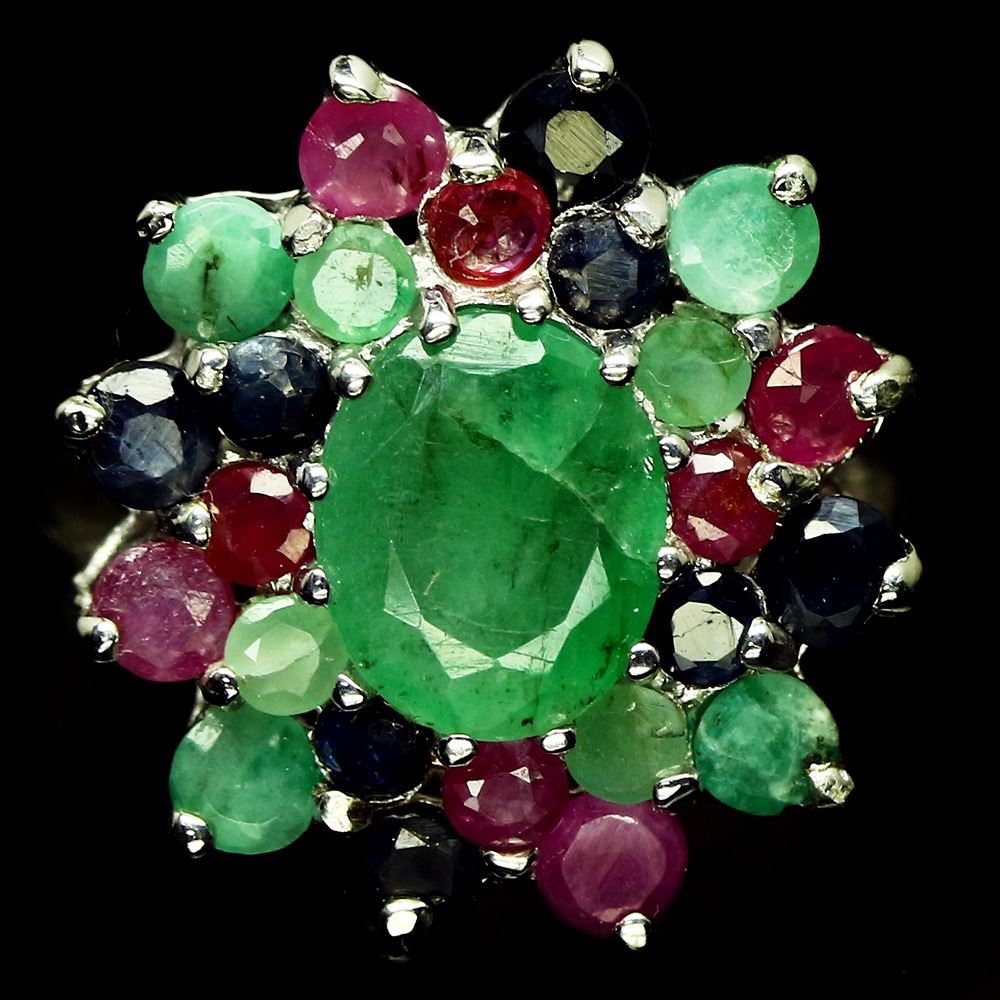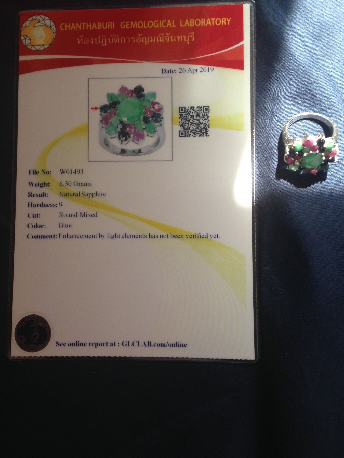 BEAUTIFUL NATURAL CERTIFIED EMERALD RUBY SAPPHIRRE RING. 15 CT TOTAL GEM WT. MOUNTED IN SOLID .925 STERLING SILVER. SZ 6 1/2.32 CTTW OR 6.3 TOTAL GET READY FOR THE COMPLIMENTS ONTHIS FINE RING. PLEASE SEE CERTIFICATIONS FOR FORTHER DETAILS.