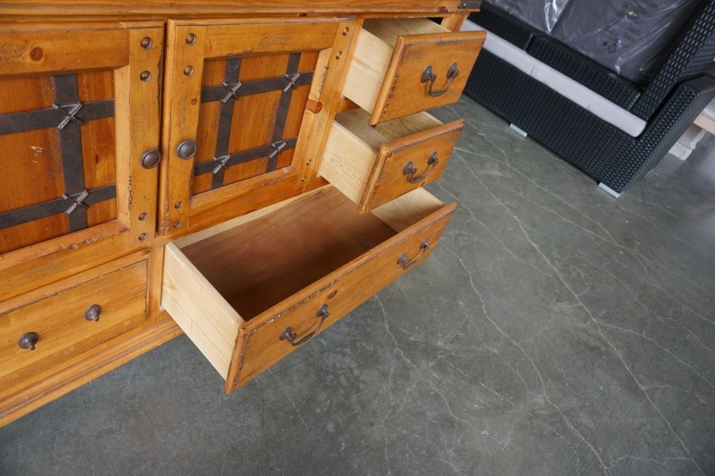 PROGRESSIVE FURNITURE 8 DRAWER DRESSER WITH MIRROR, METAL BANDING, RUSTIC - 88 INCHES TALL WITH MIRROR, DRESSER 66 INCHES WIDE X 40 INCHES TALL