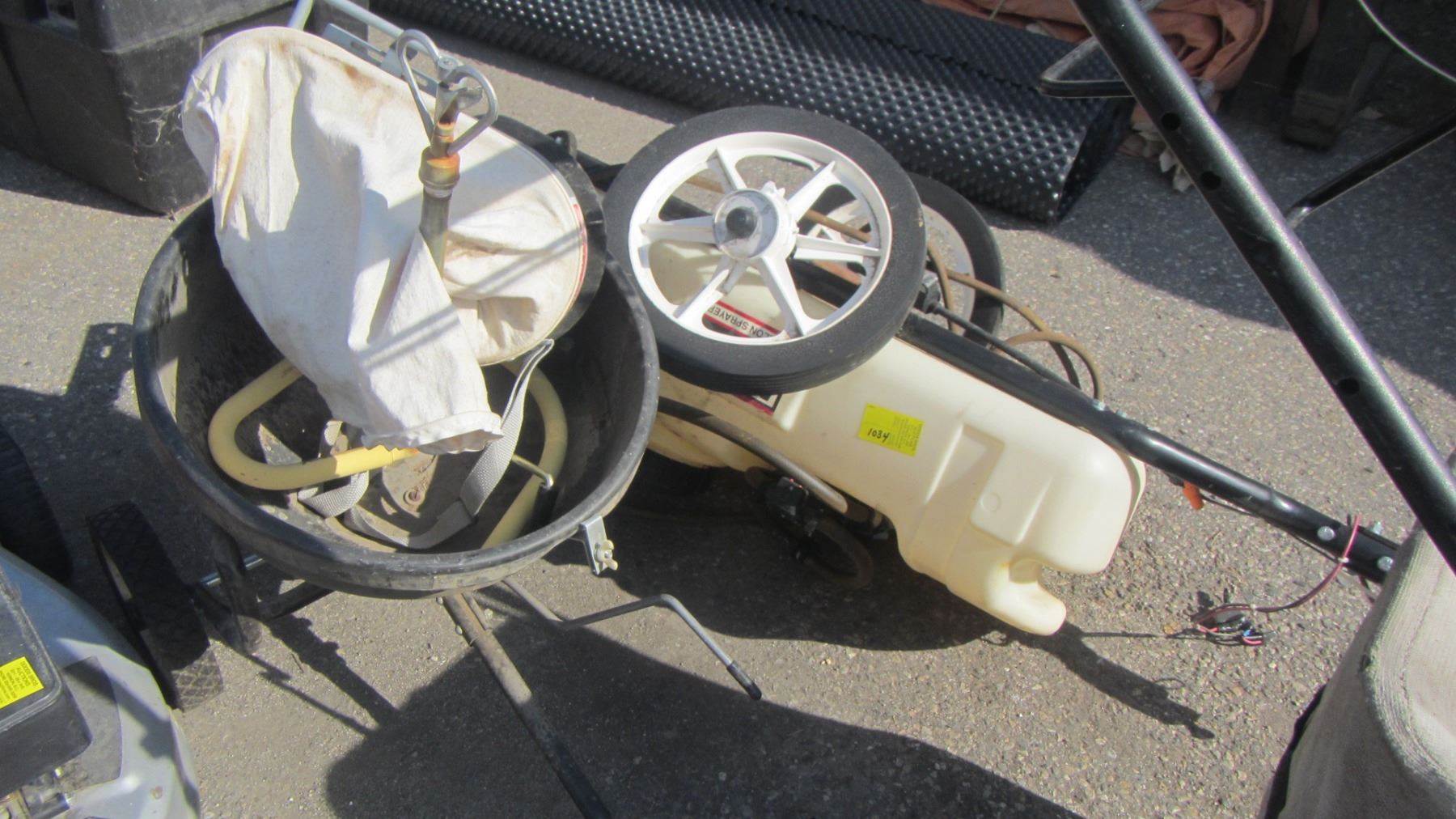 PULL BEHIND SPRAYER & PULL BEHIND FERTILIZER SPREADER W/SPRINKLER, ETC., SPRAYER HAS BROKEN WHEEL