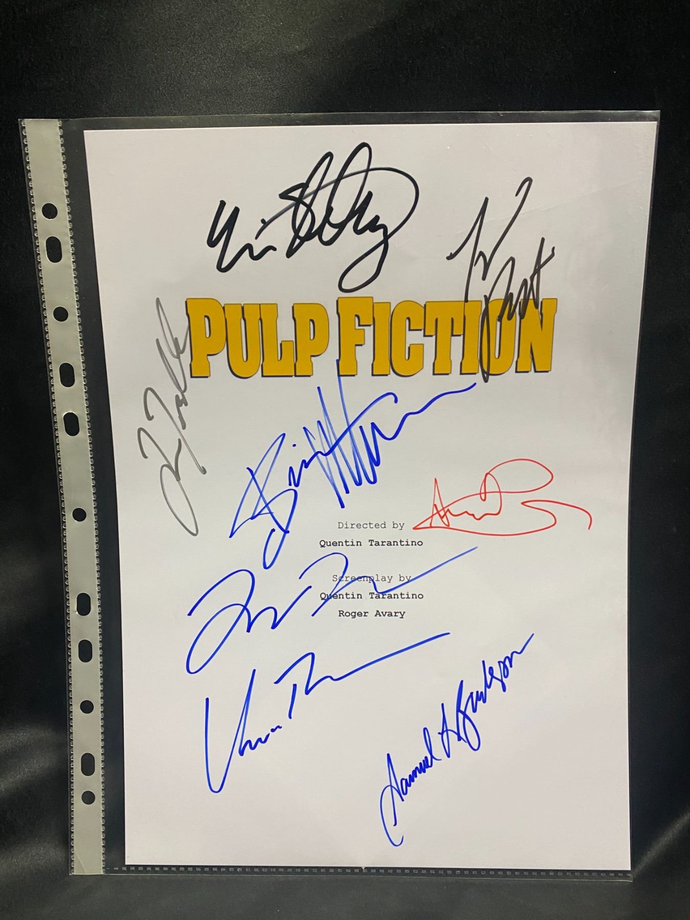 PULP FICTION SIGNED SCRIPT COVER WITH COA AUTOGRAPHS INCLUDE: UMA THURMAN, JOHN TRAVOLTA, SAMUEL L JACKSON, TIM ROTH, AMANDA PLUMMER, ERIC STOLTZ, BRUCE WILLIS, QUENTIN TARANTINO