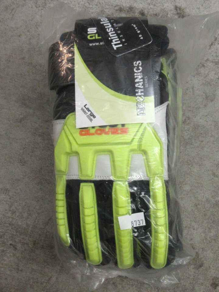 Size Large. Thinsulate lined. Green neon rubber protective finger strips. Velcro wrist bands.
