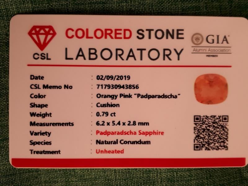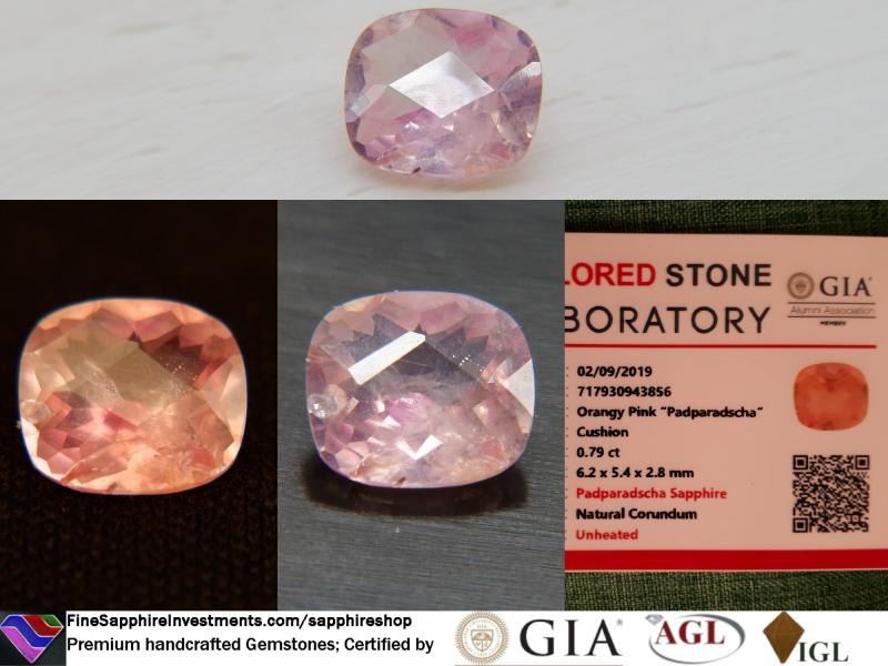 Padparadscha sapphire, true sunset-color, GIA 0.79 ct