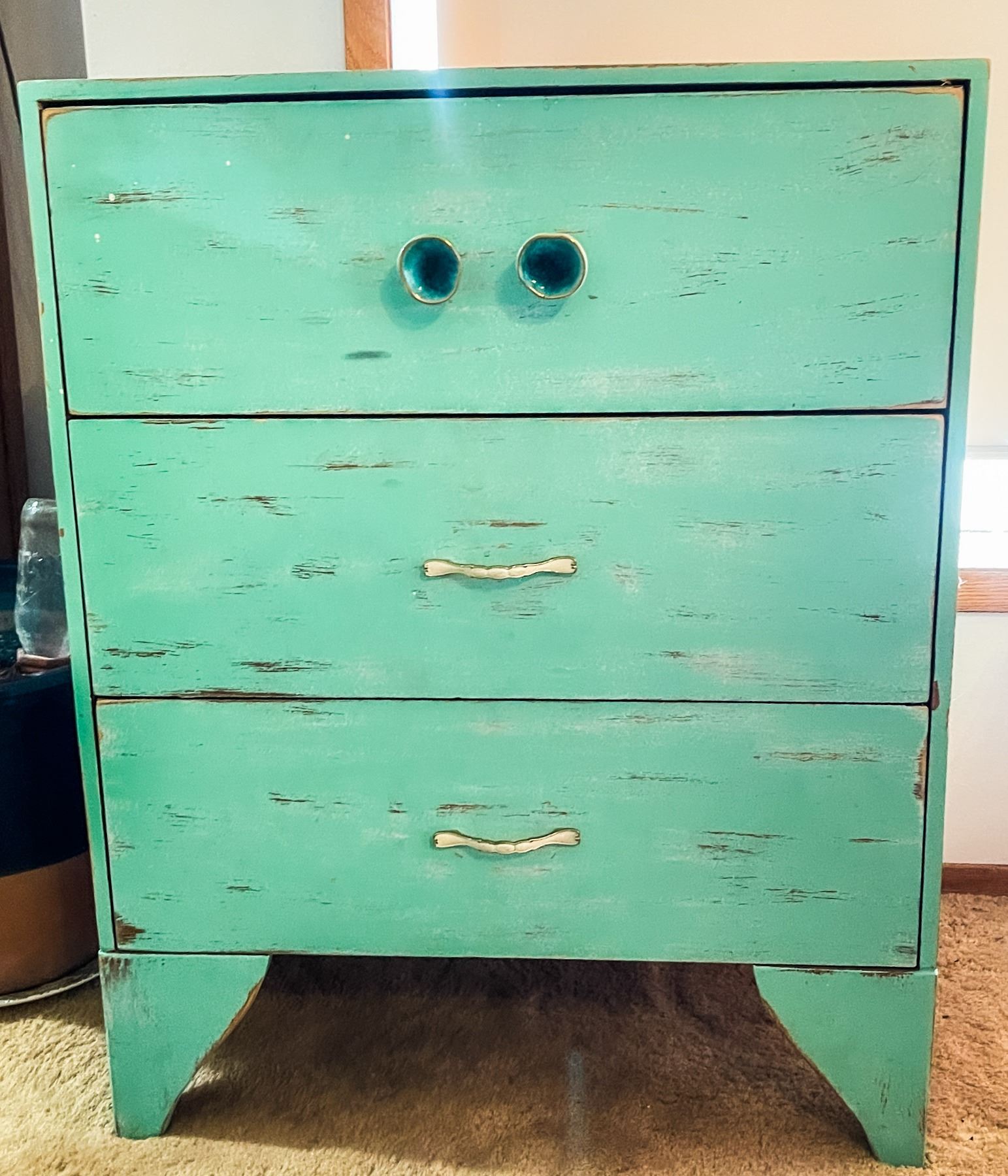 Charming three-drawer chest finished in distressed turquoise with unique ceramic pulls from Anthropologie. Measures approx. 24”W x 16”D x 30”H – a stylish accent piece with plenty of storage.