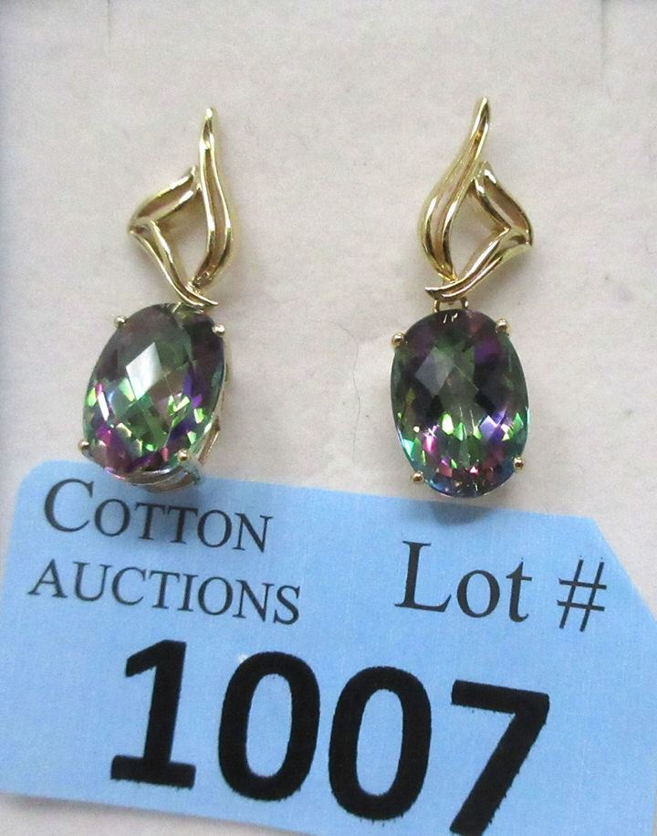 Each earring has a 8.5 Carat Faceted Oval Mystic Topaz. Faces of the gemstones measure 13.9 x 9.7 mm. Post and butterfly back. Total weight including gemstones: 6.7 grams. Approximately 2.5 grams of gold.