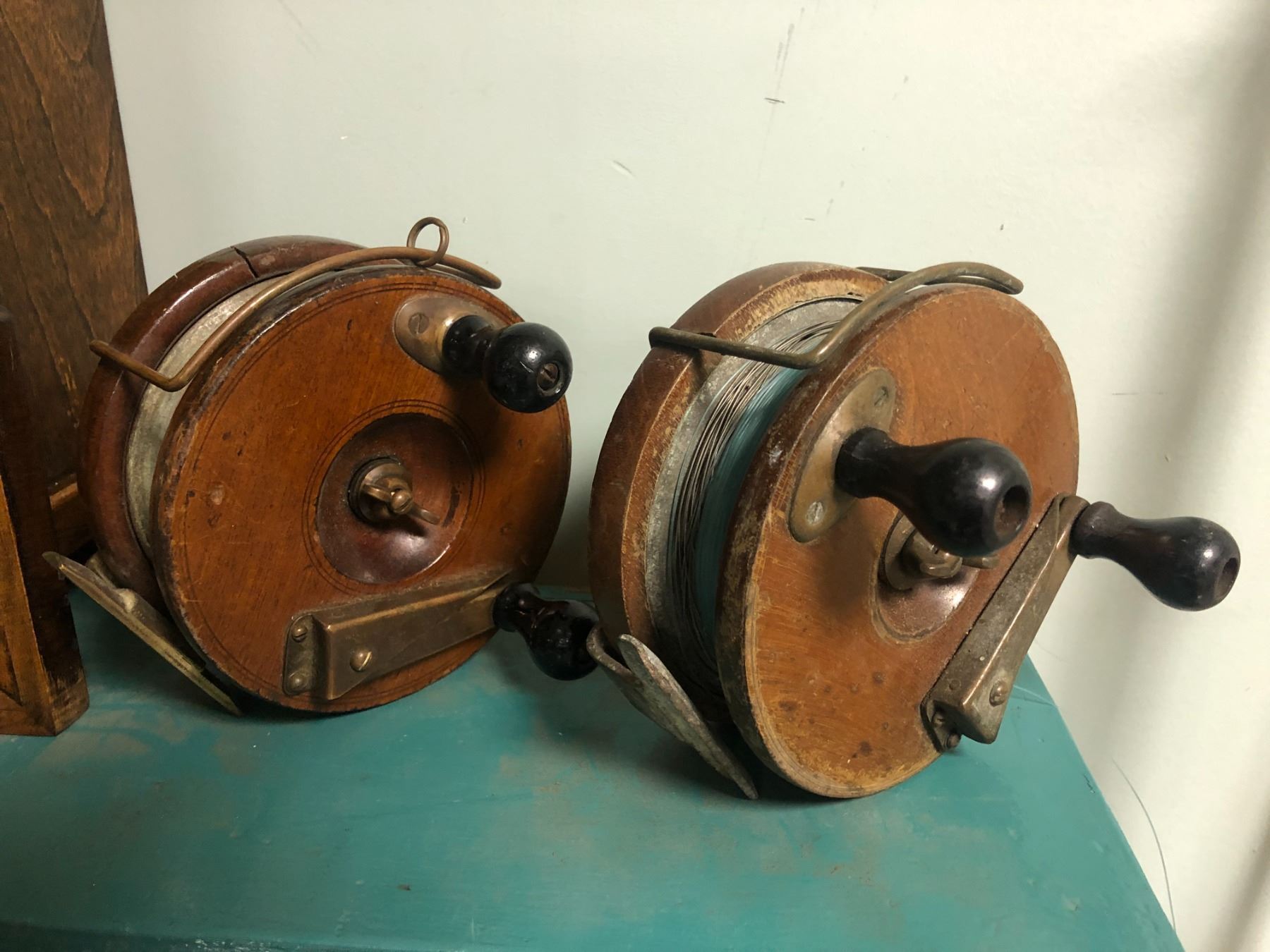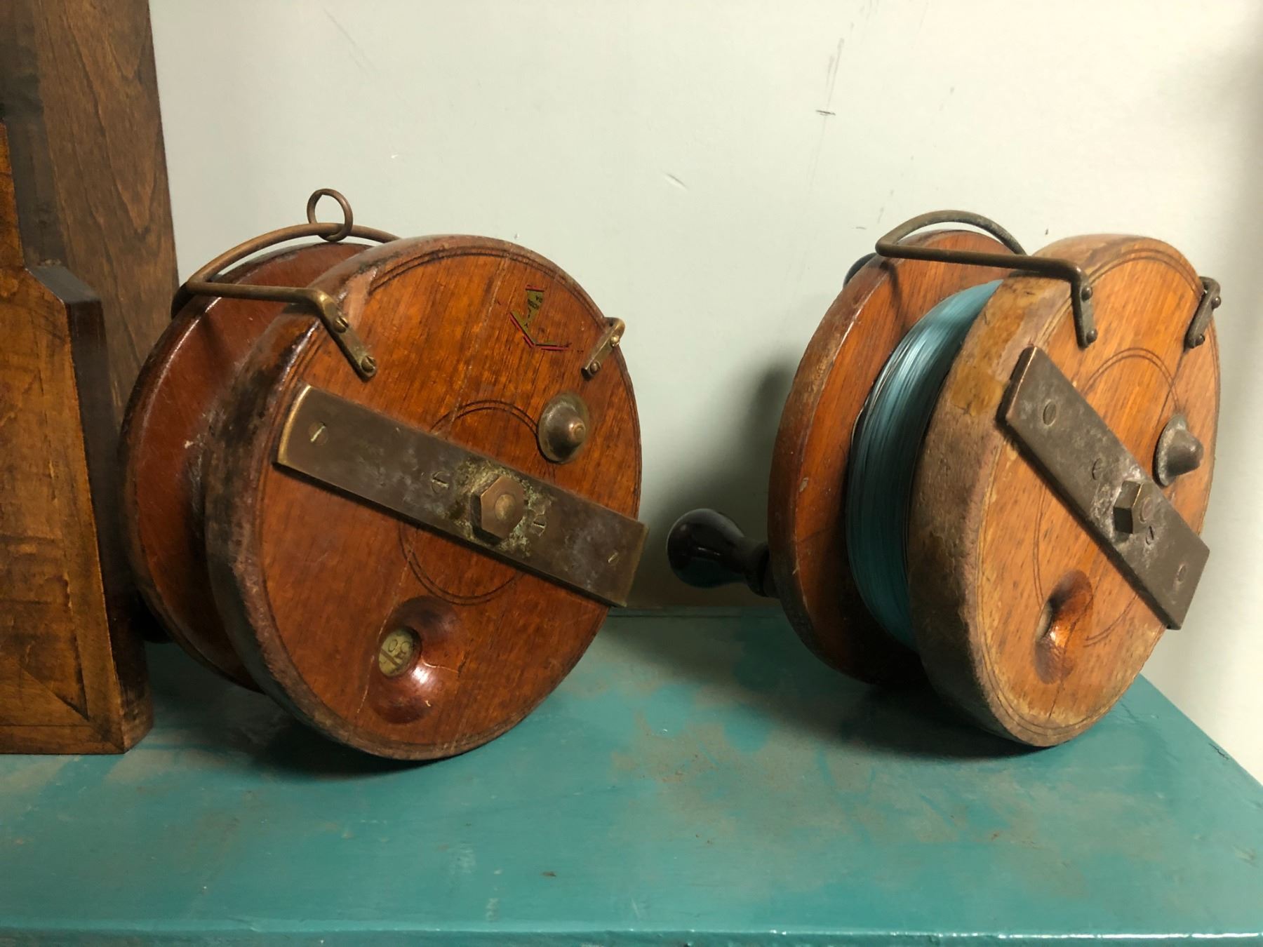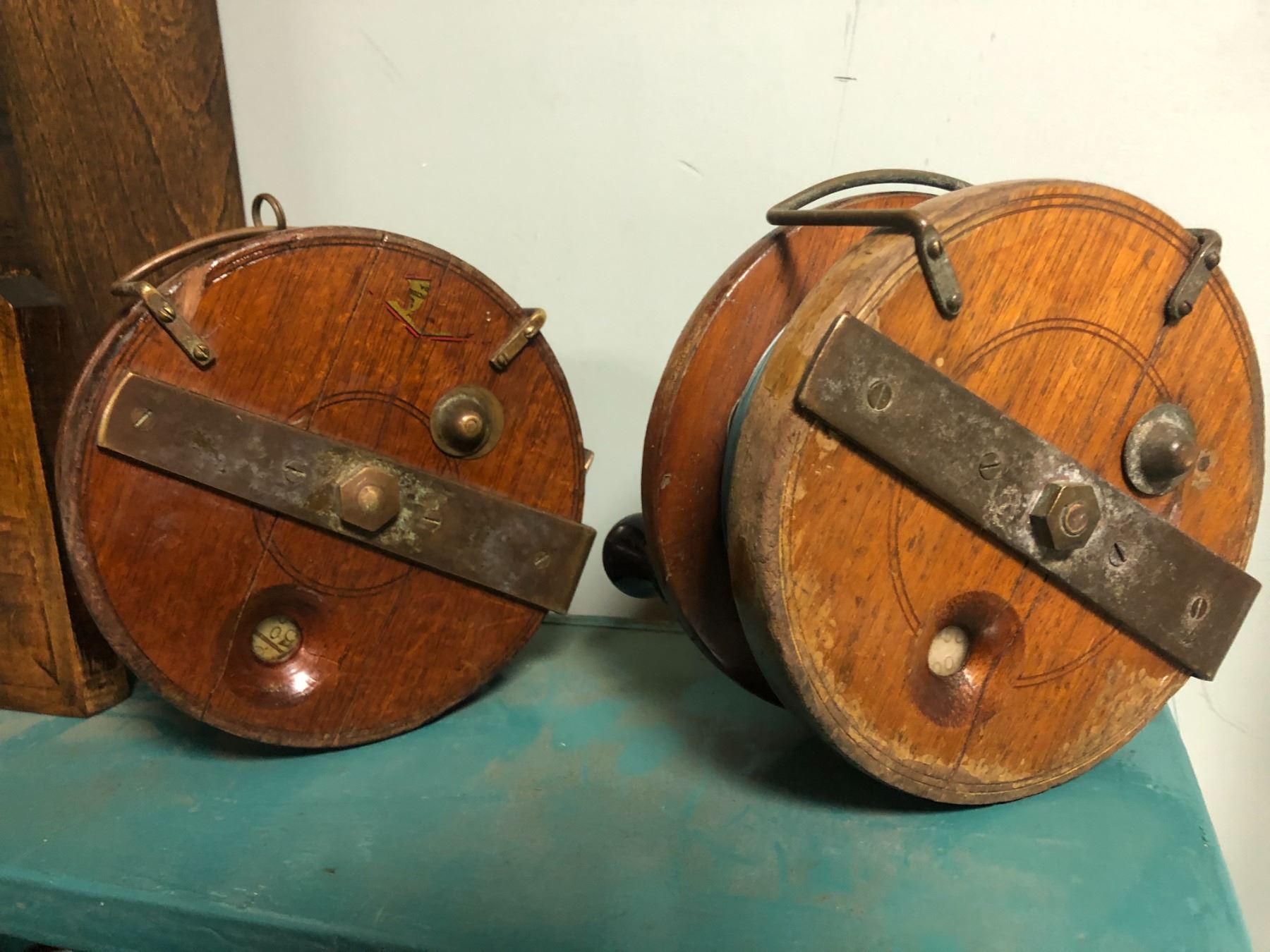 Pair of 6in vintage Peetz wood & brass trolling reels