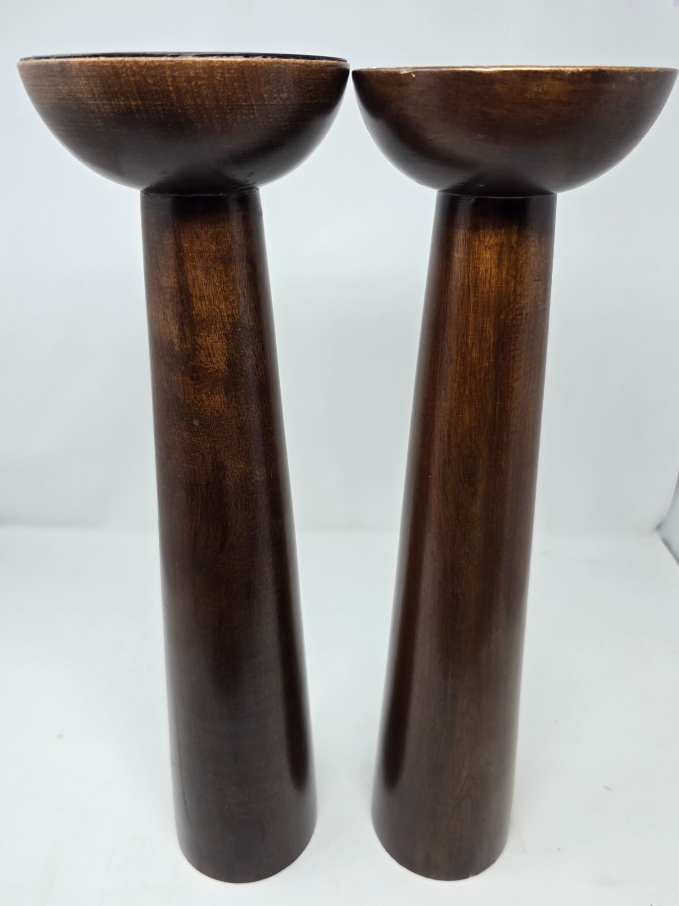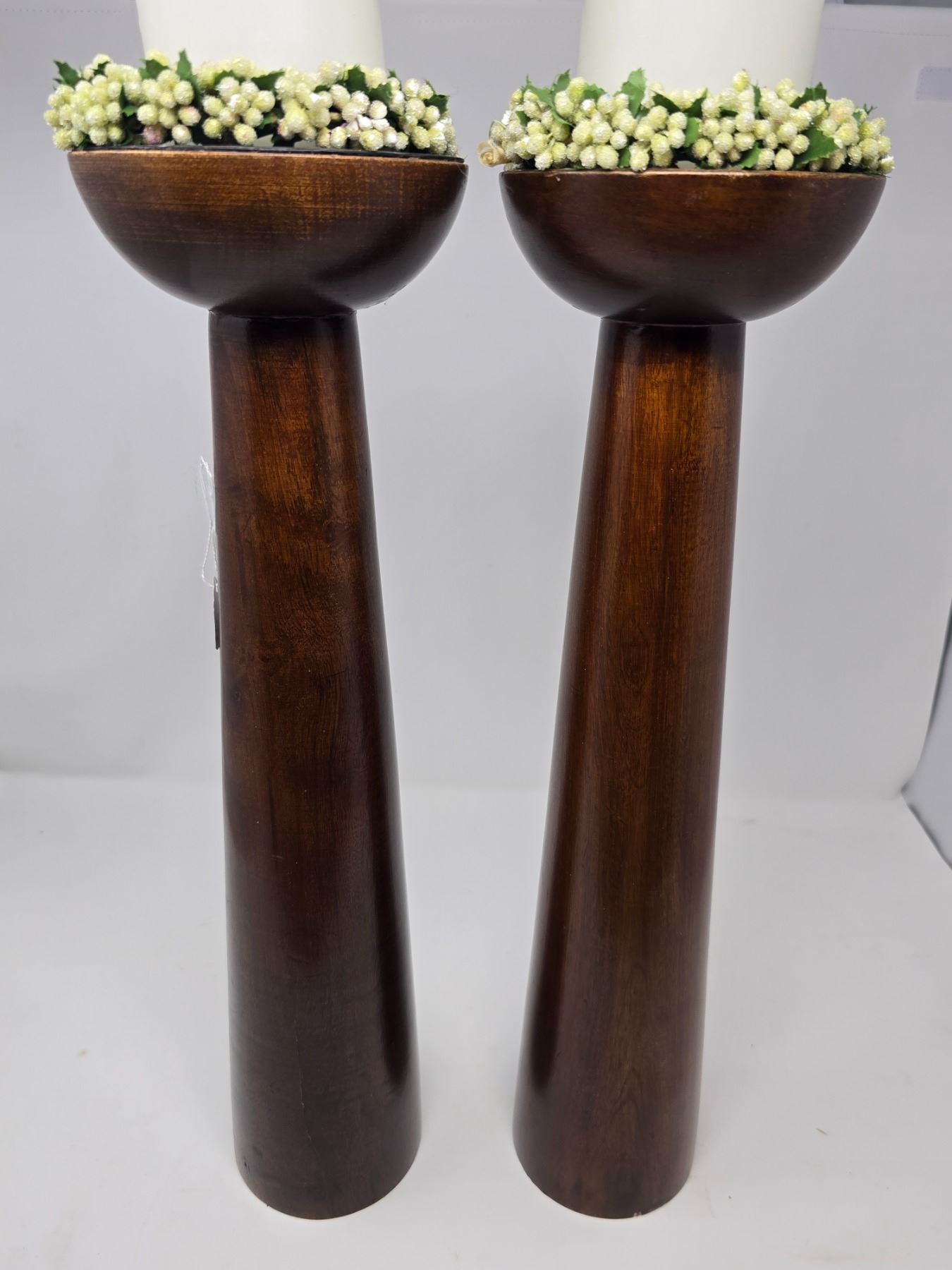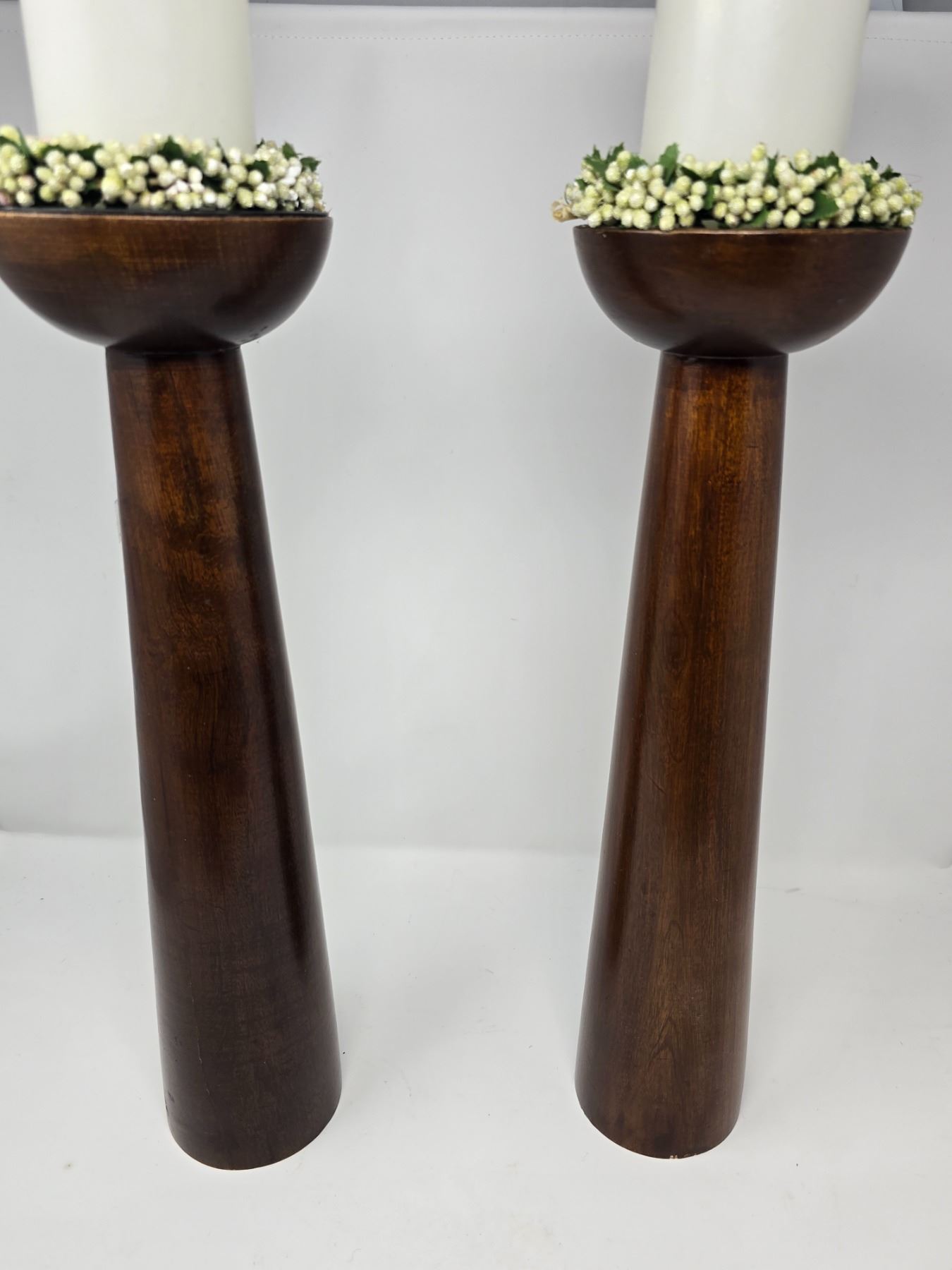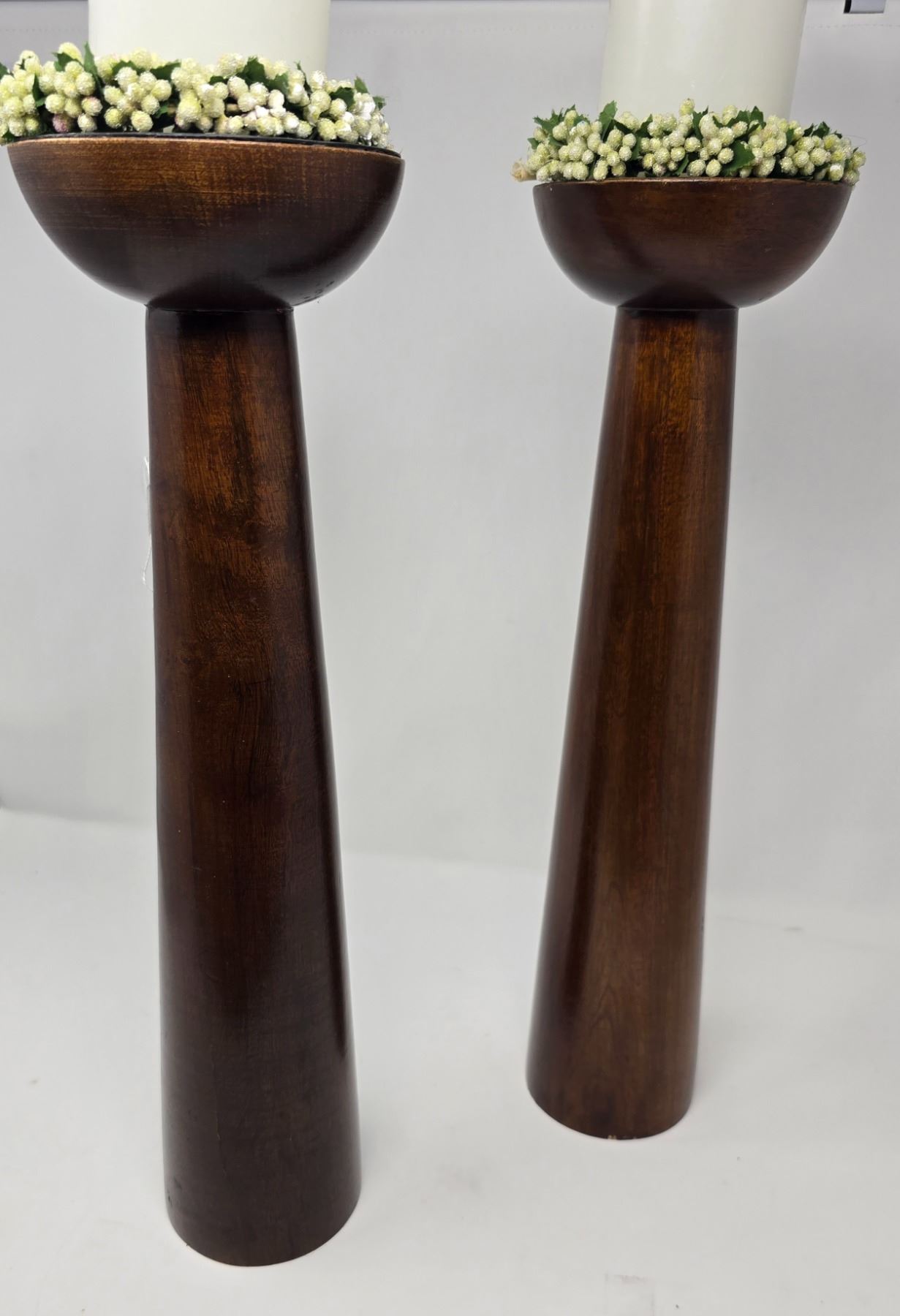 Set of two tall, sleek dark-stained wooden candle holders with white pillar candles and floral trim. Clean modern lines with warm, classic charm.