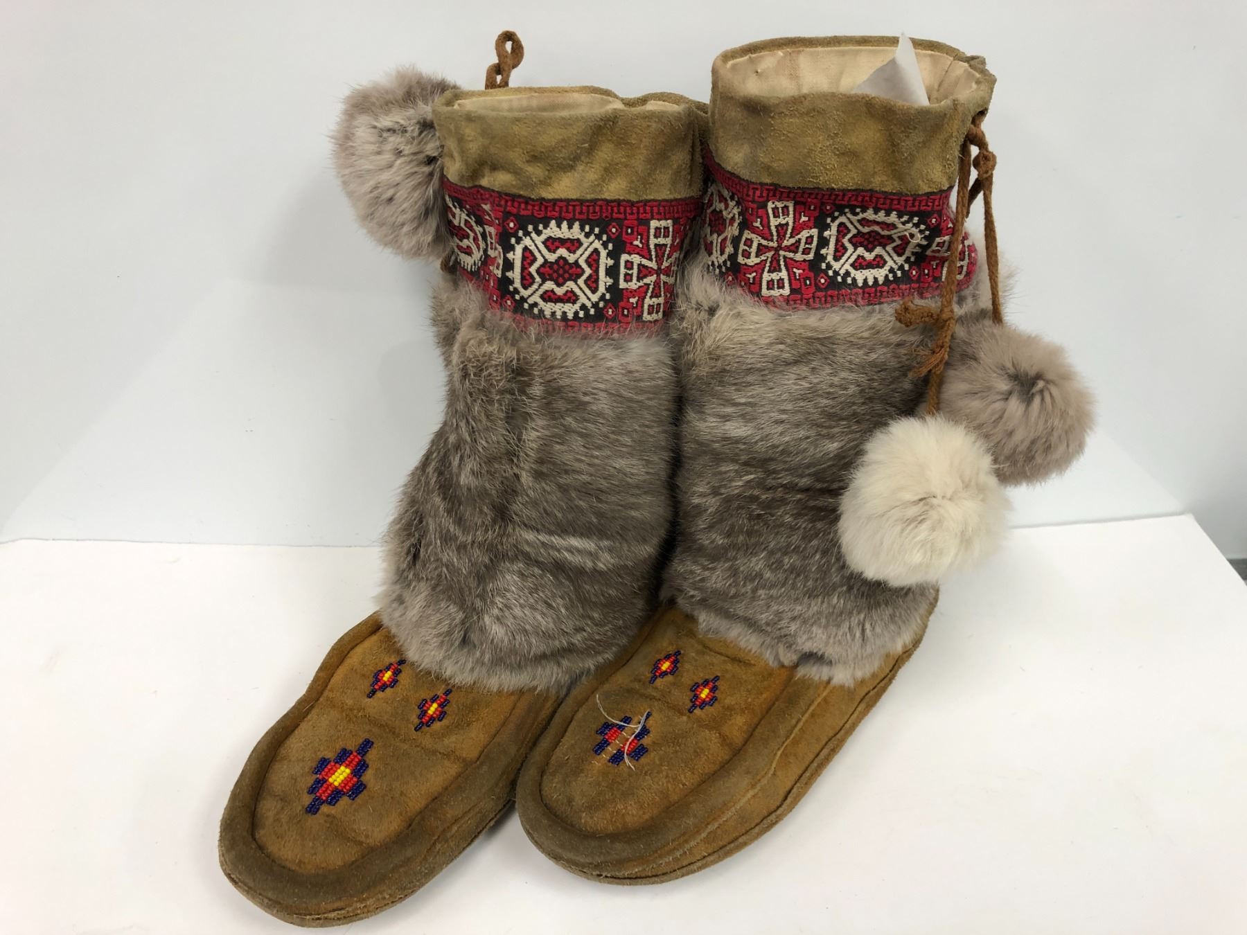 Pair of First Nations moccasins w/ rabbit fur & bead accents