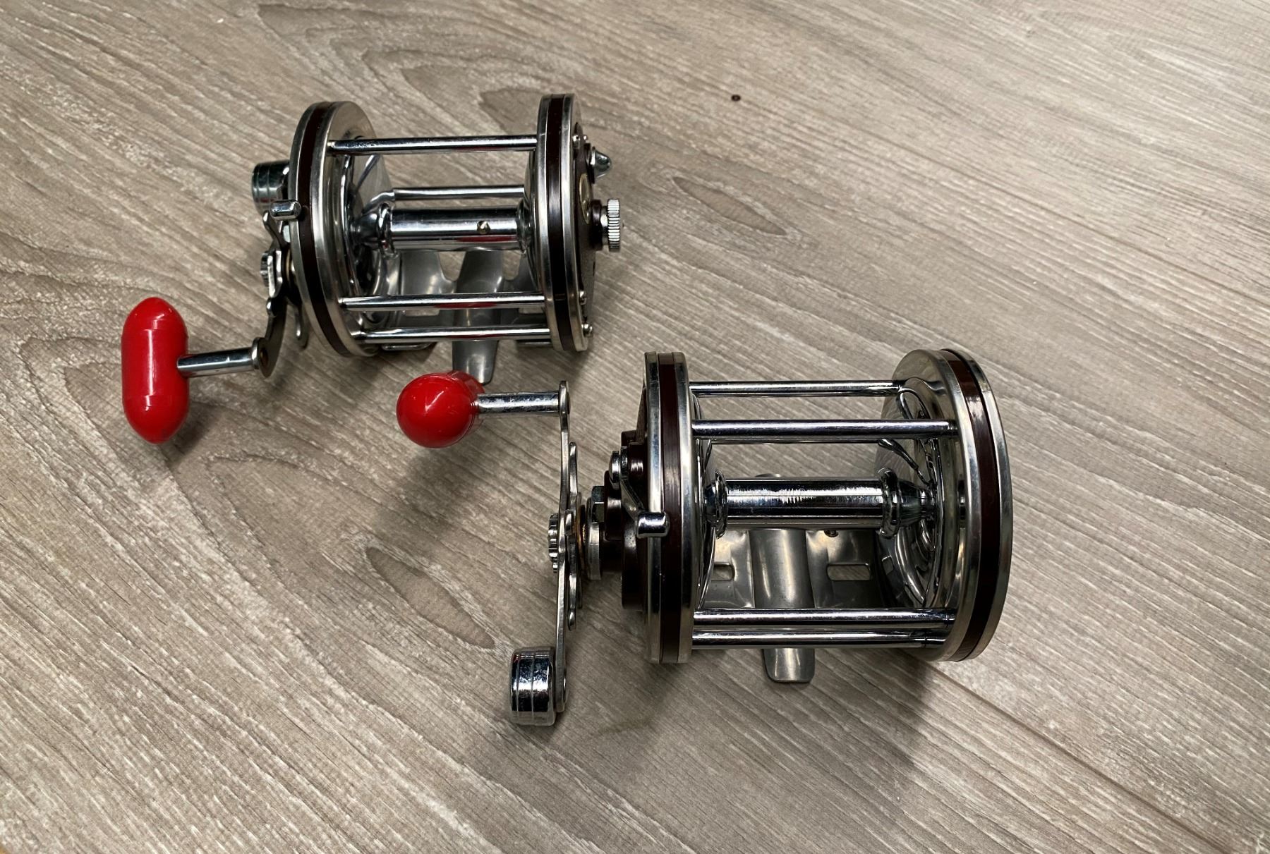 Pair of Immec 140-D level-wind fishing reels - burgundy with red handles