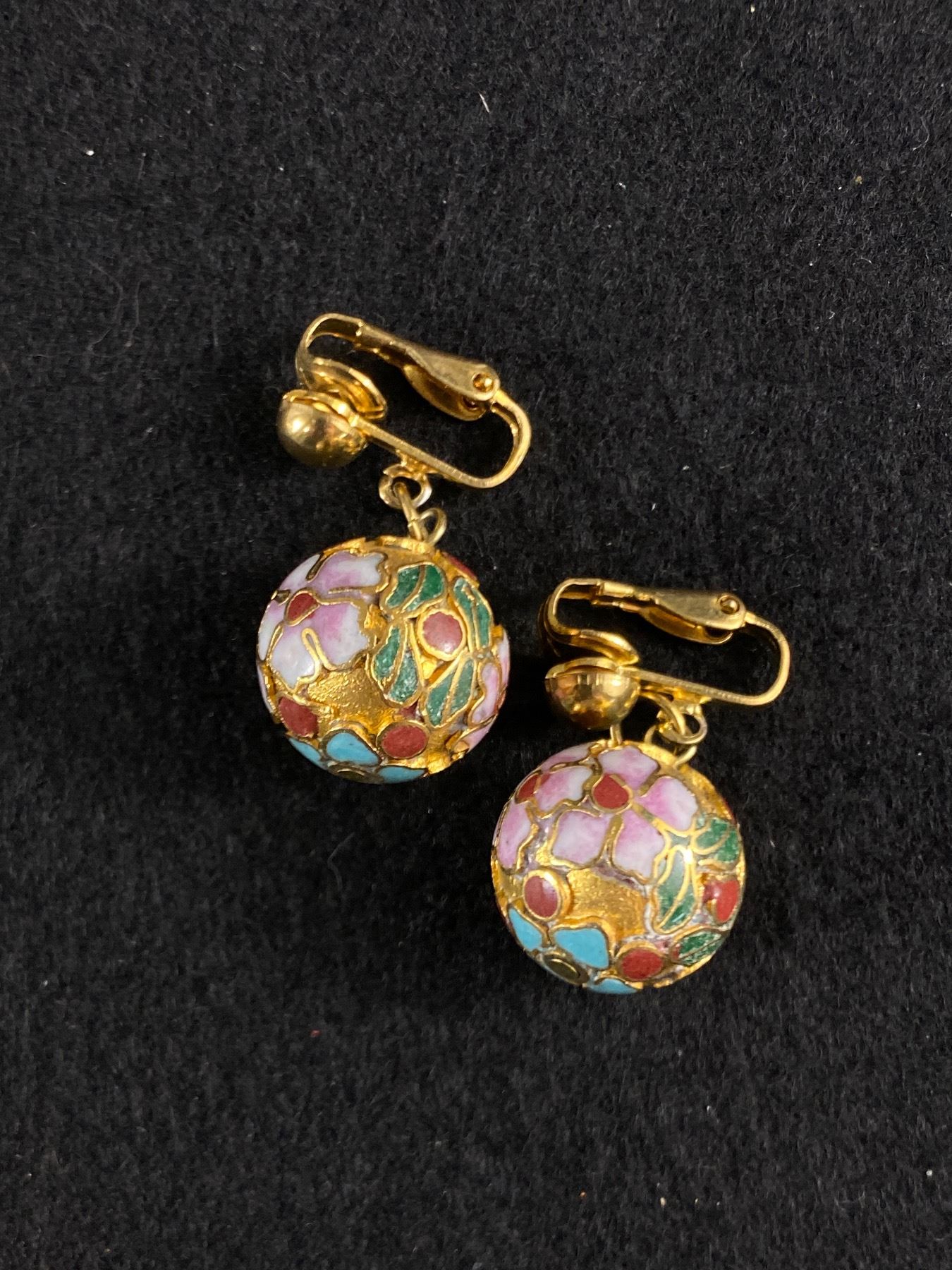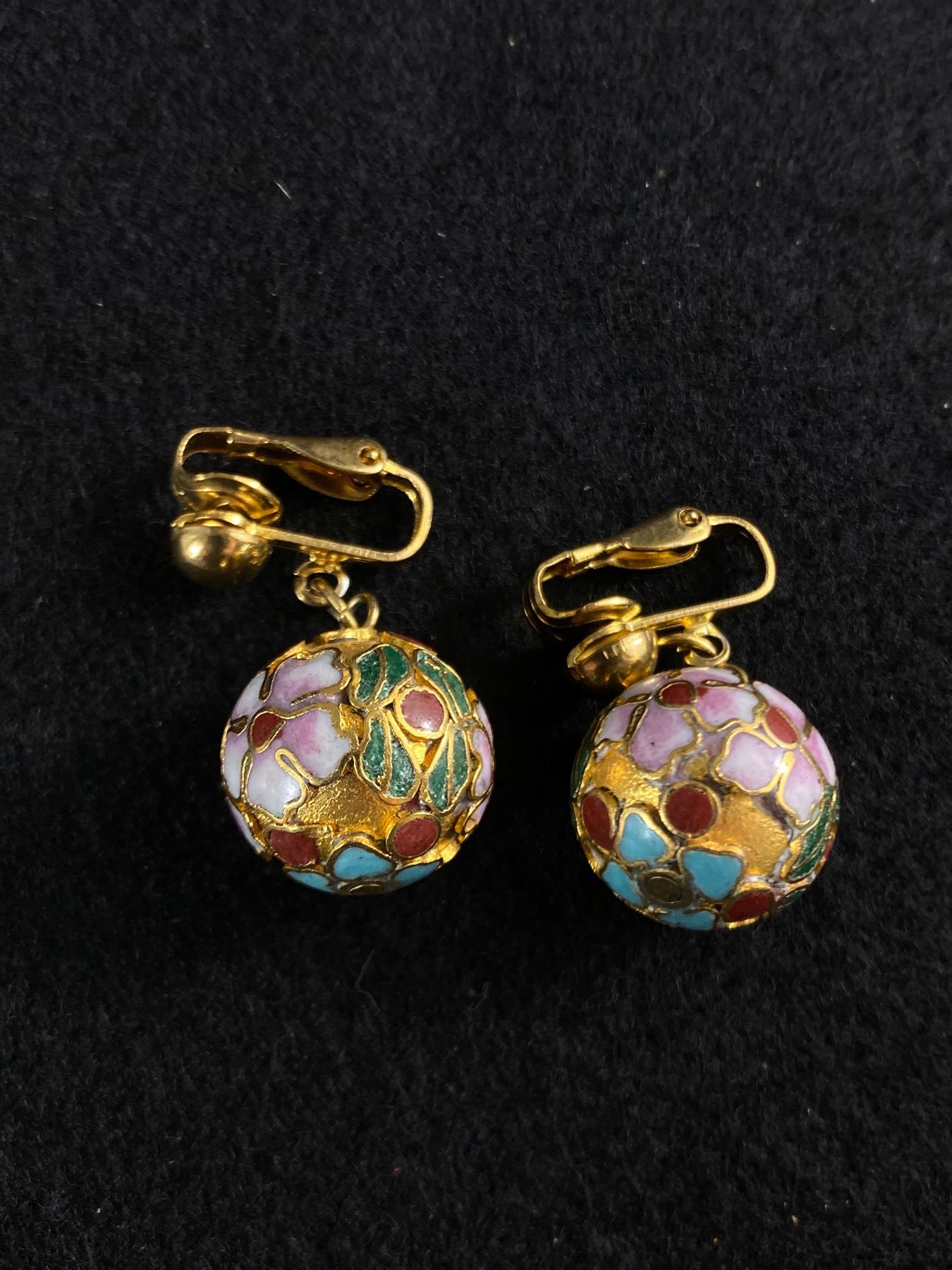 Pair of Vintage Chinese Cloisone Enamel Gold Bead Earrings