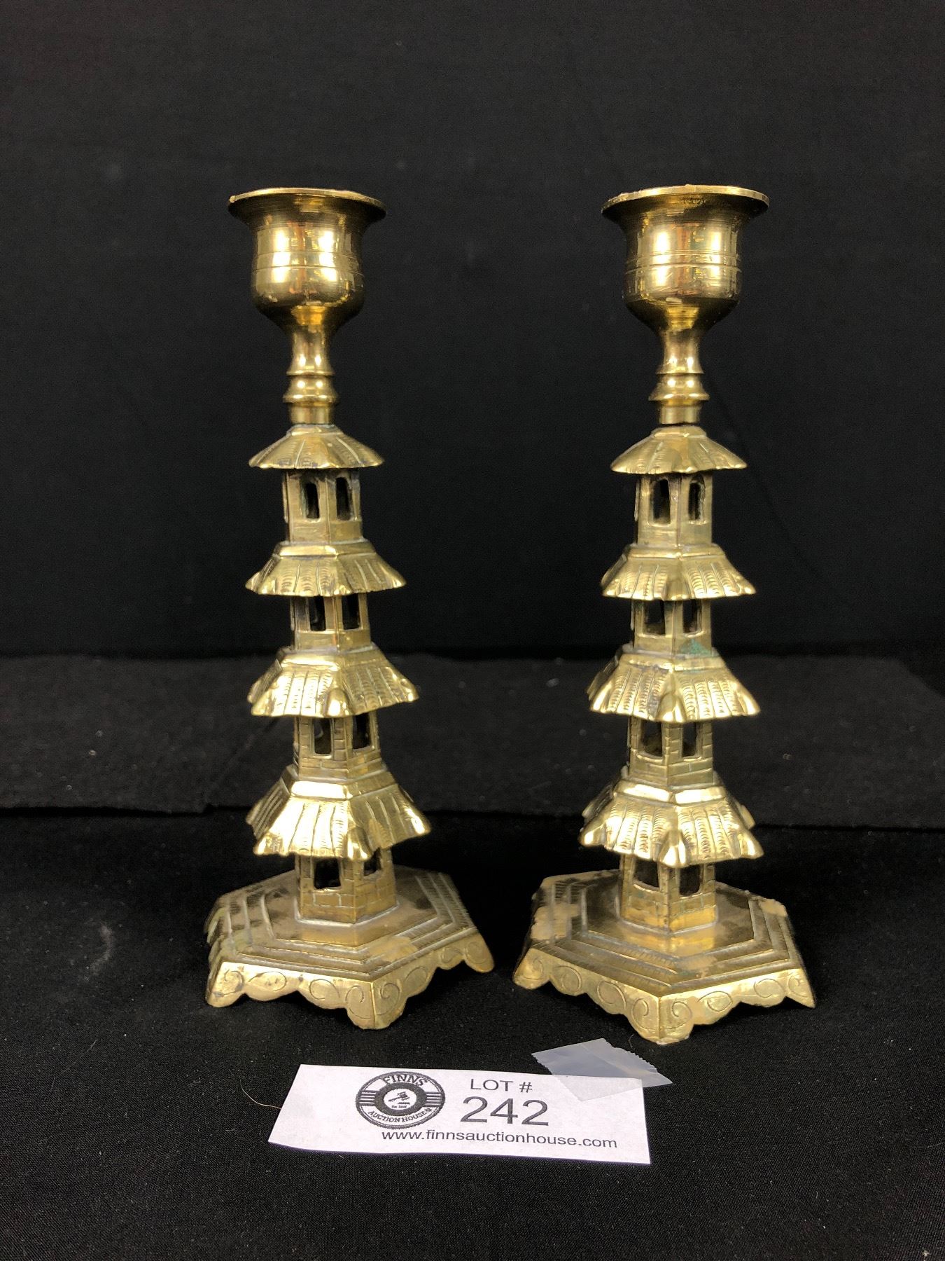 Pair of Vintage Heavy Brass Pagoda Style Candle Holders