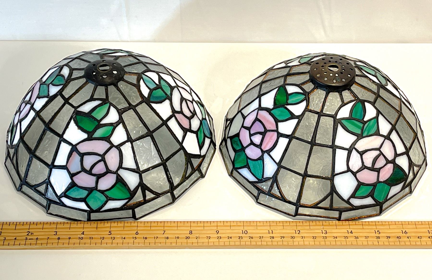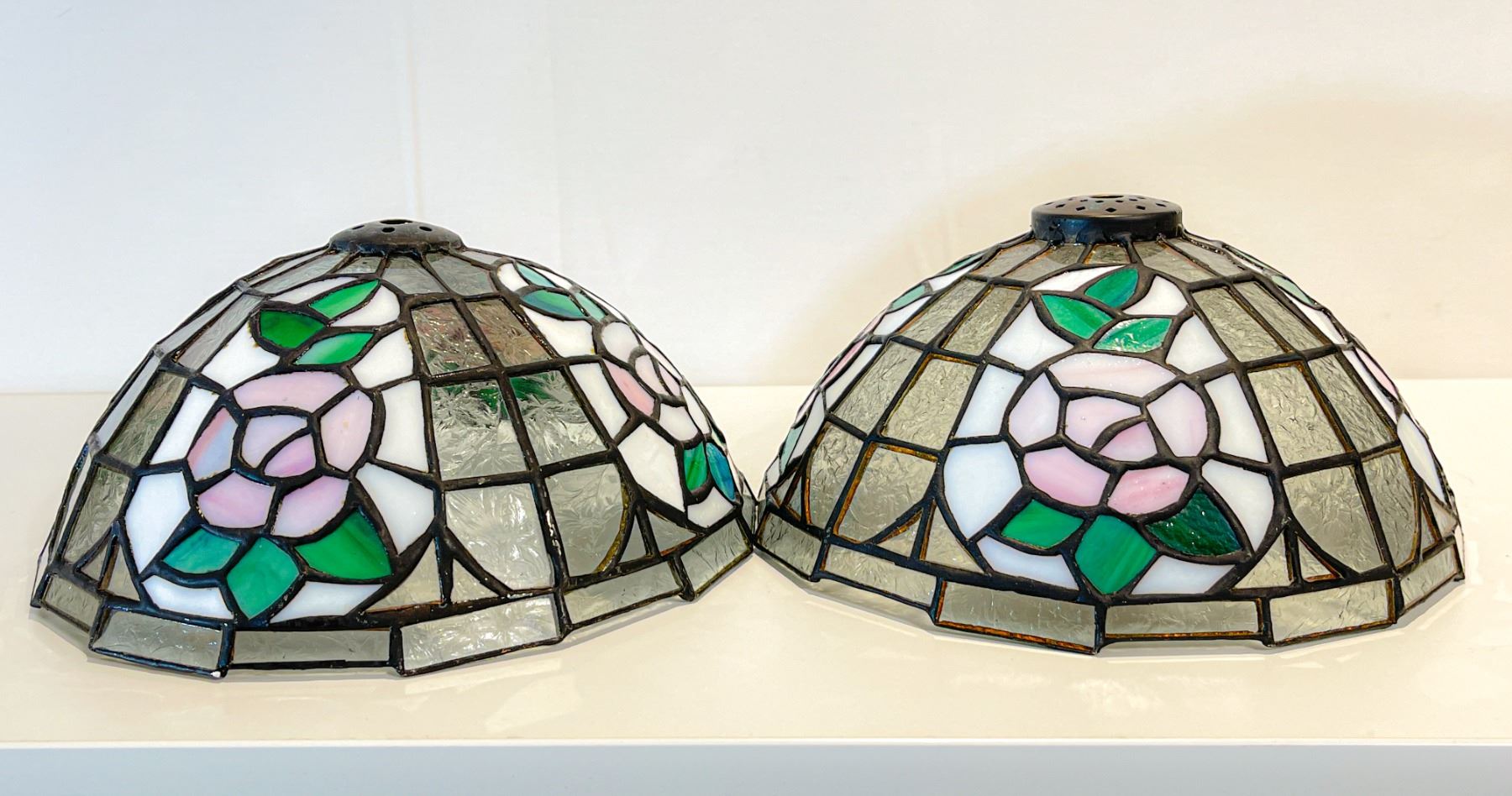 Matching pair of vintage stained glass lamp shades, featuring a lovely pink rose and green leaf motif on frosted glass panels. Each shade measures approximately 26 cm (10 in) in diameter. Handcrafted in the Tiffany-style with soldered metal framework. These classic dome shades work beautifully as pendant lights or replacements for vintage table lamps—well-matched pair with elegant coloring and craftsmanship.