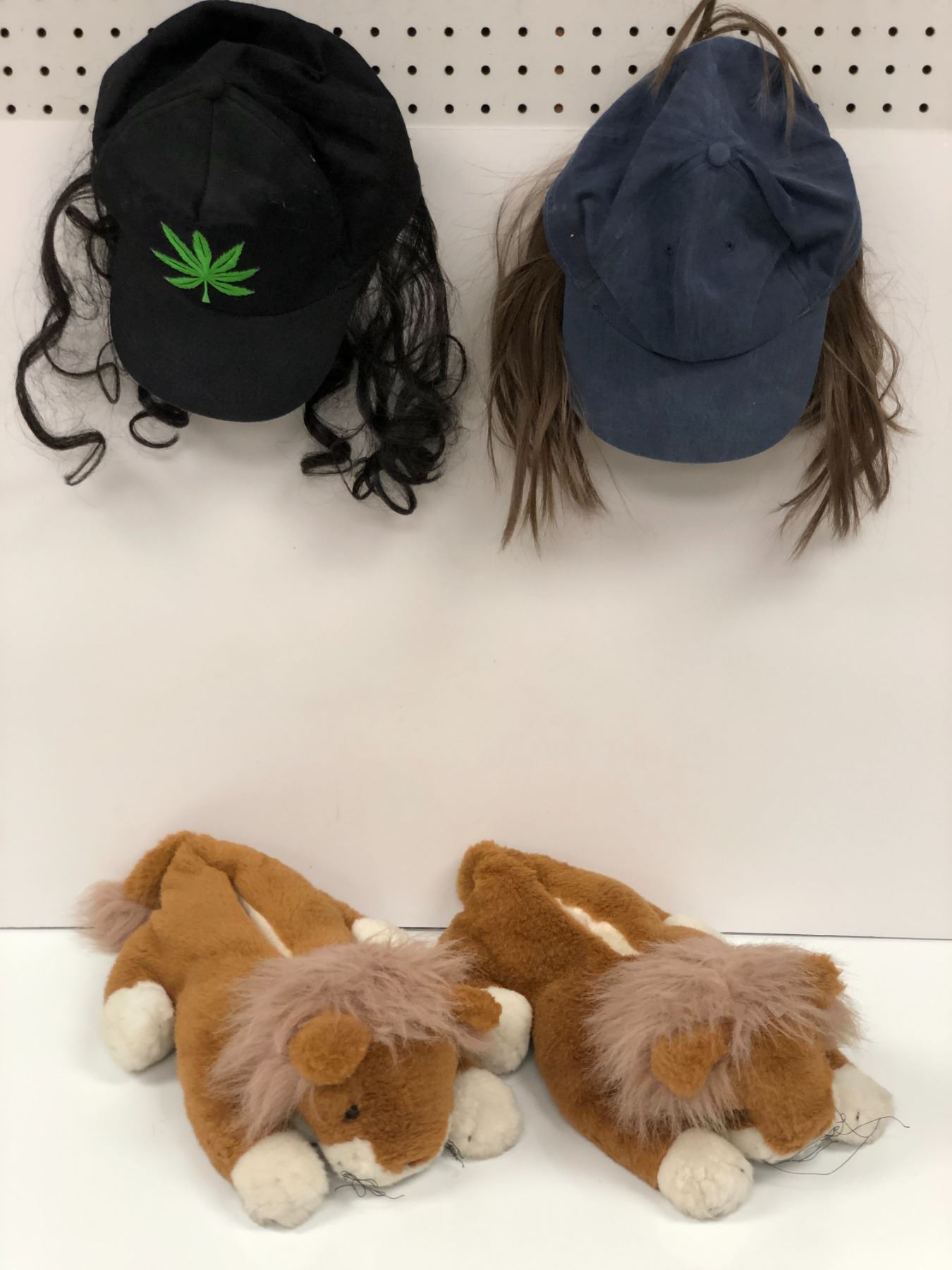 Pair of bunny slippers & 2 ball caps w/ authentic looking hair attached