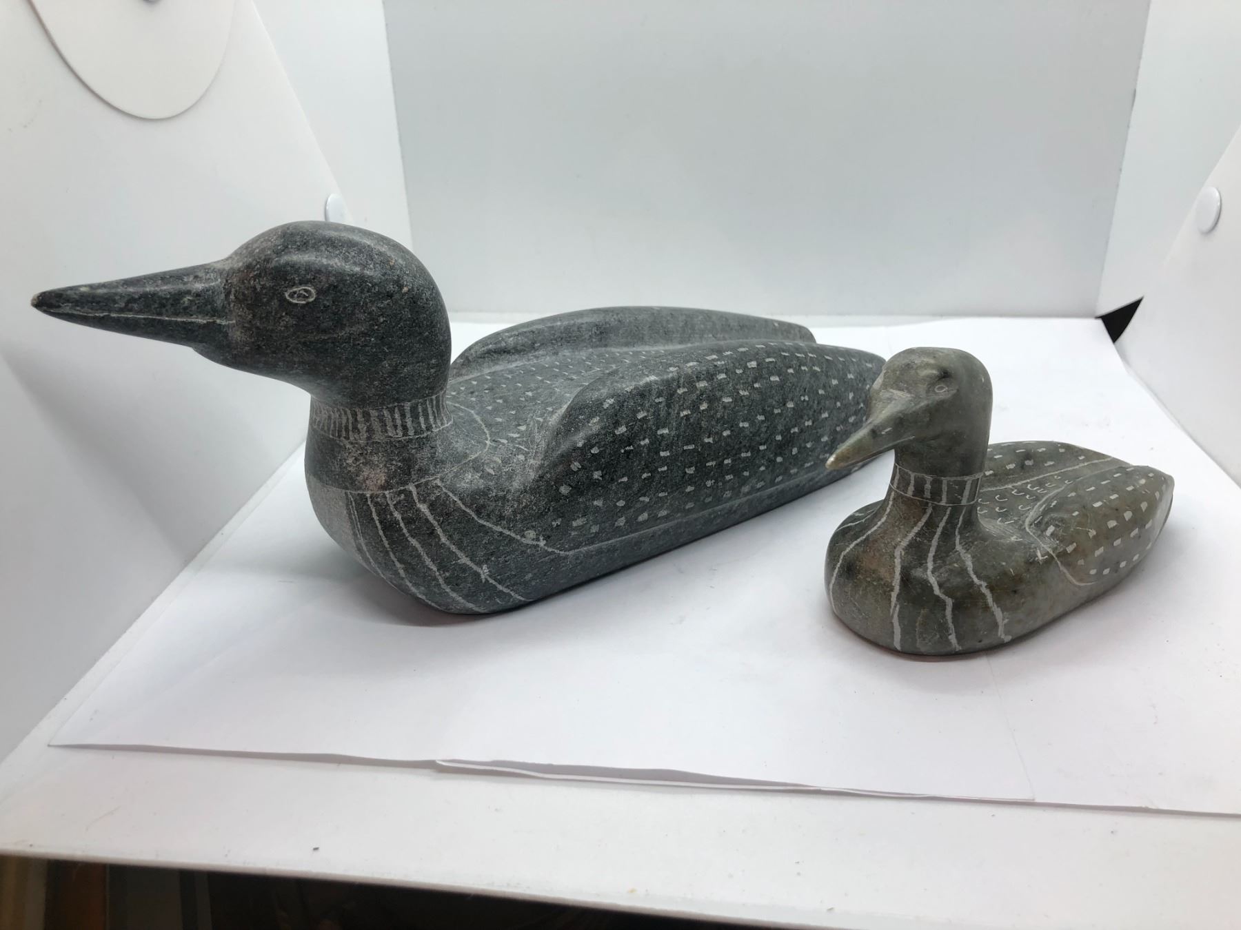 Pair of carved soapstone birds (signed on bottom) - approx. 10in x 4in & approx. 5 1/2in x 2in