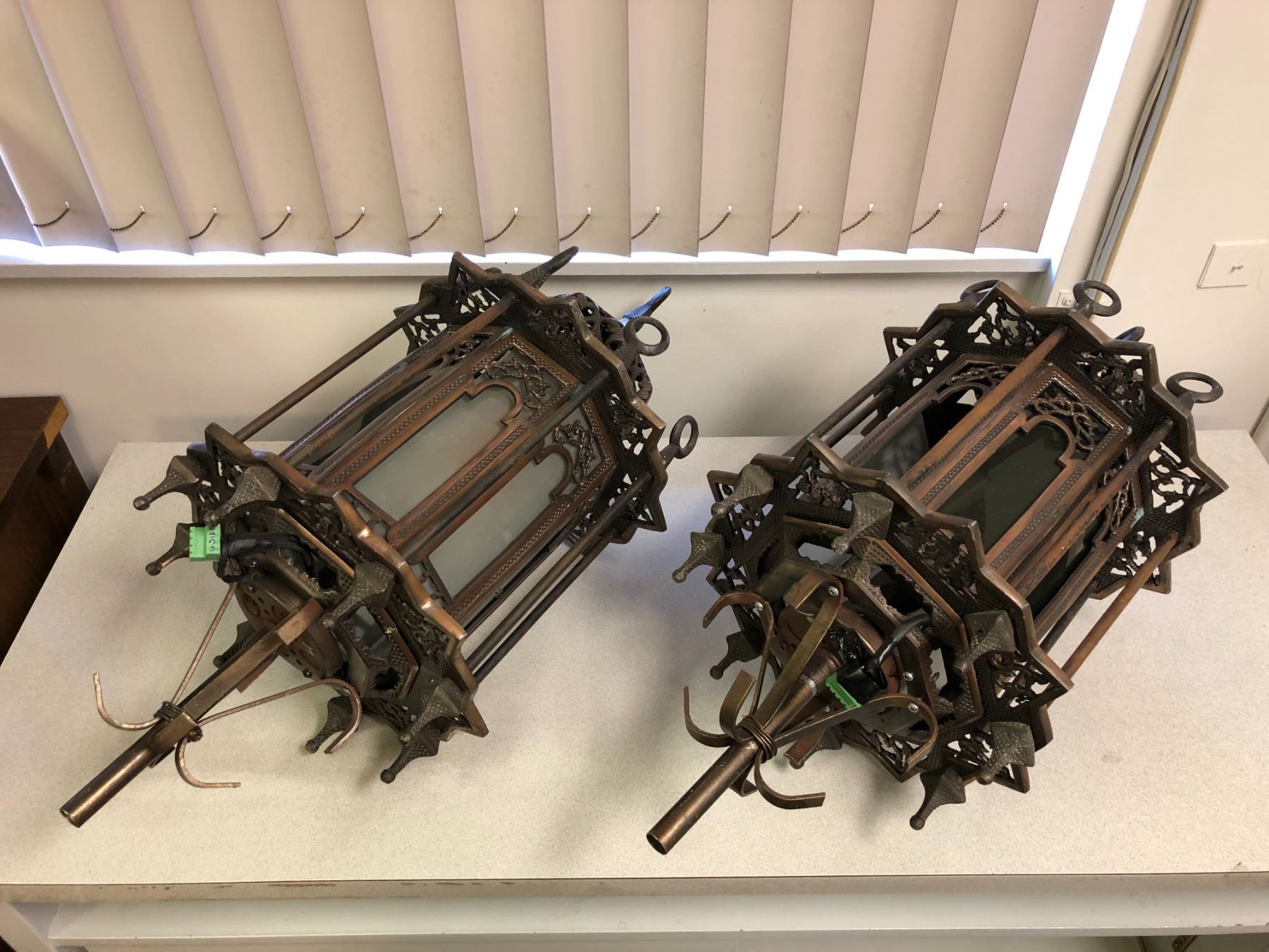 Pair of ornate metal hanging lights from the popular Sci-fi series