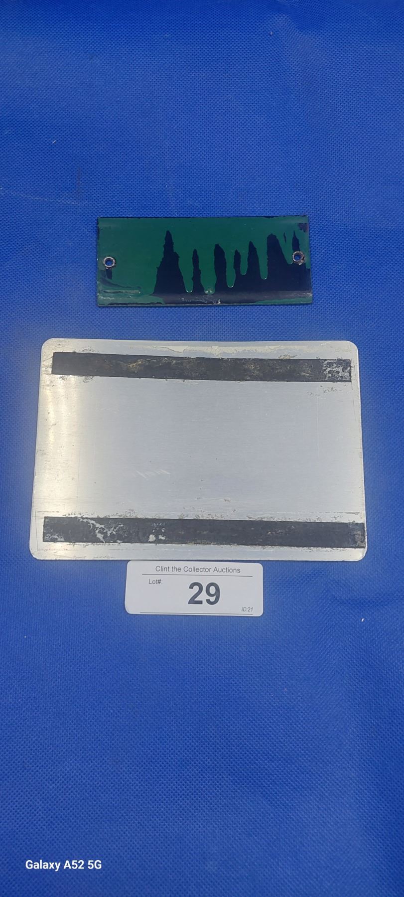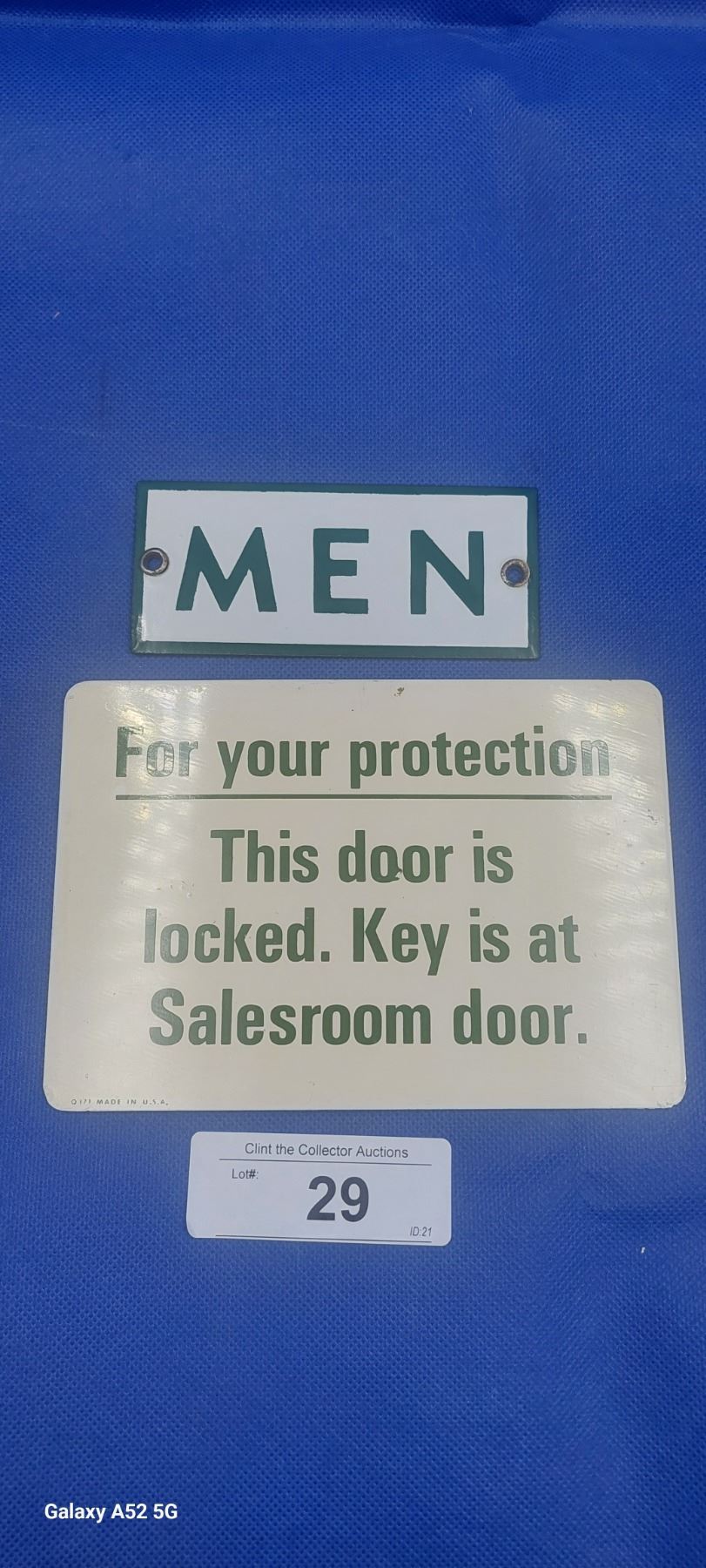 Pair of vintage metal restroom signs, largest 6.5"x5"