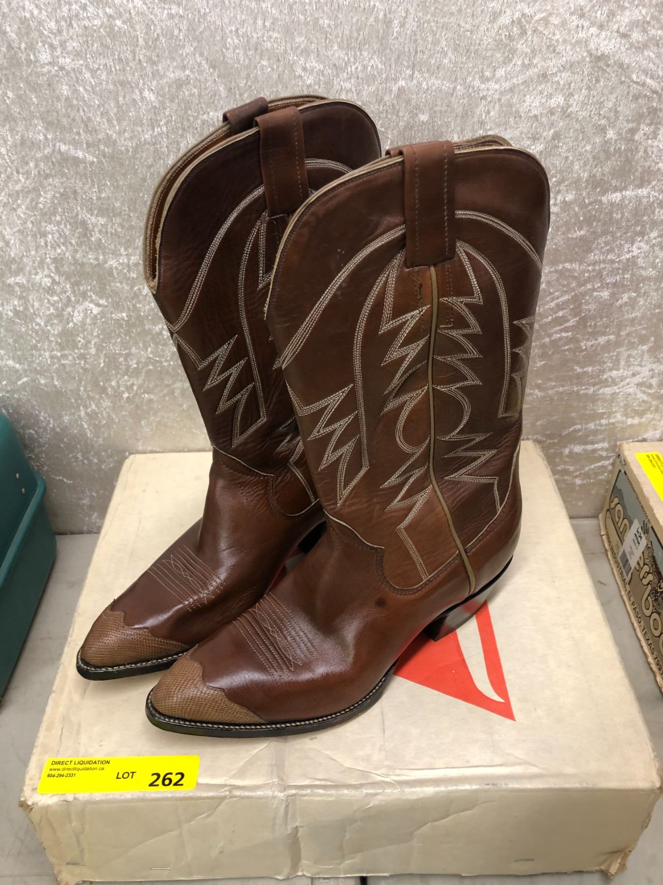 Pair sanders dark brown w/ beige toe tip coco cowboy boots size 9 1/2 (NOS)