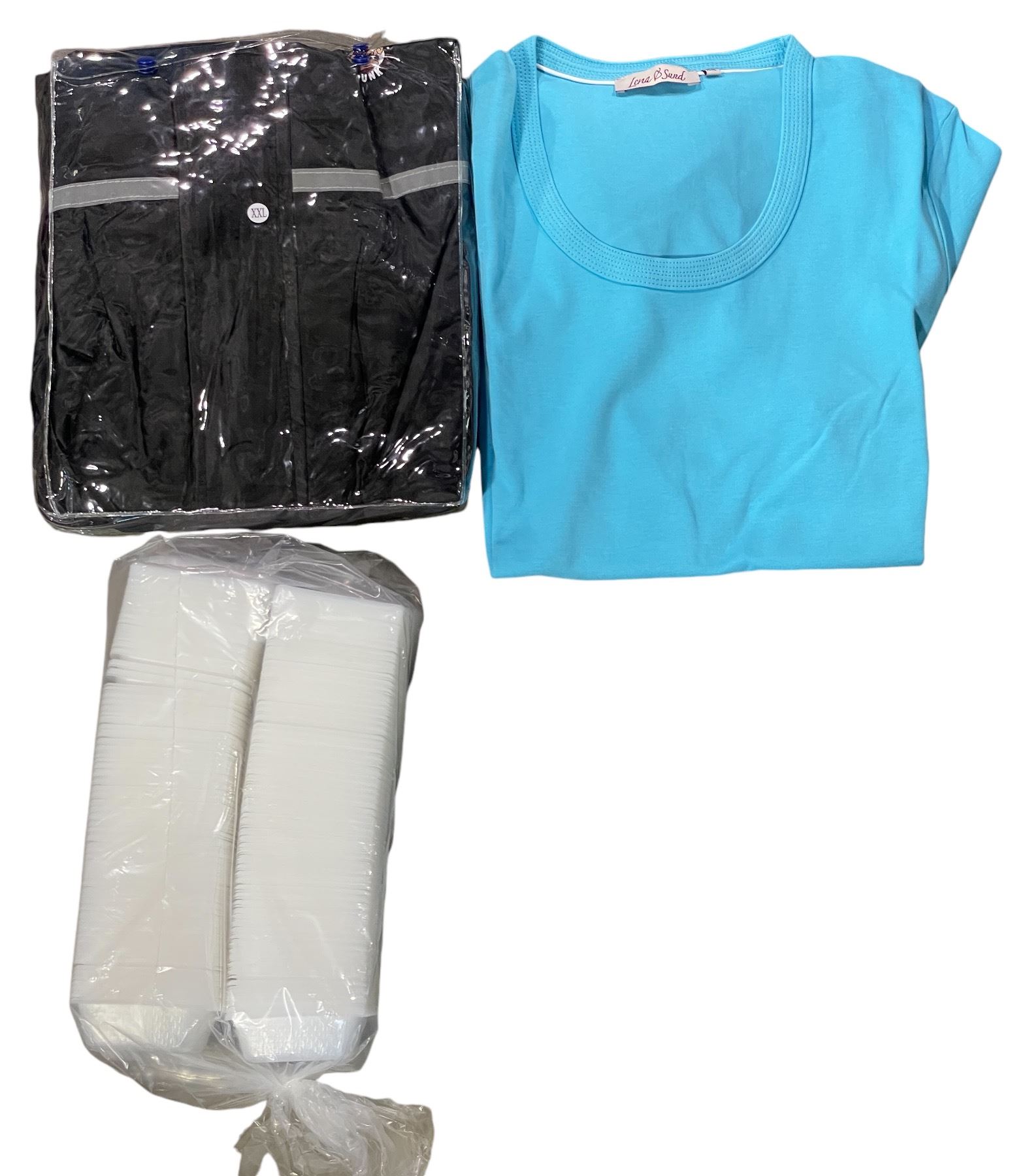Pallet full of assorted clothing & misc. - brand new clothes/ waterproof jackets/ food containers etc.