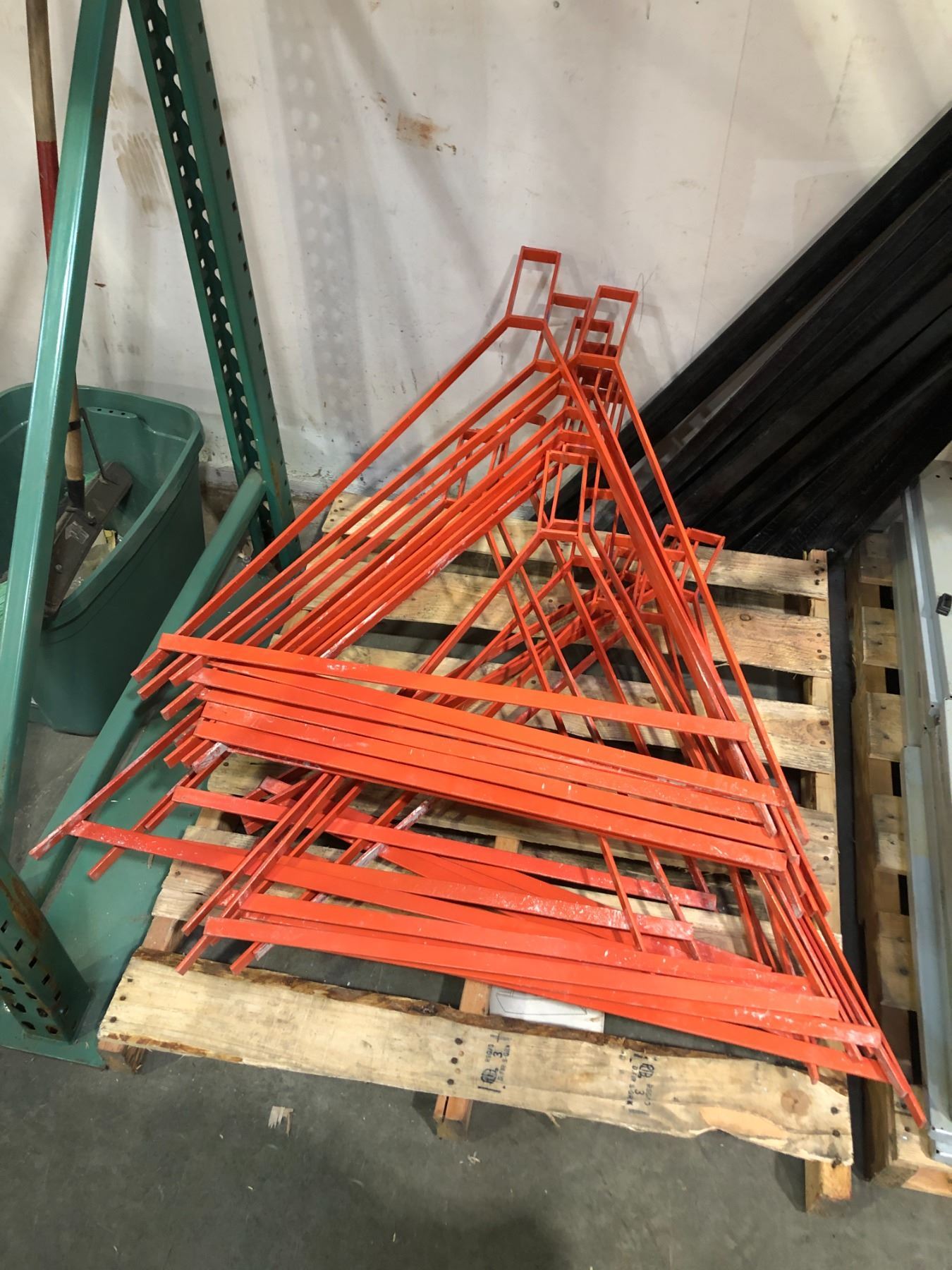 Pallet full of orange A-frame steel barricade legs (approx. 25 pieces)