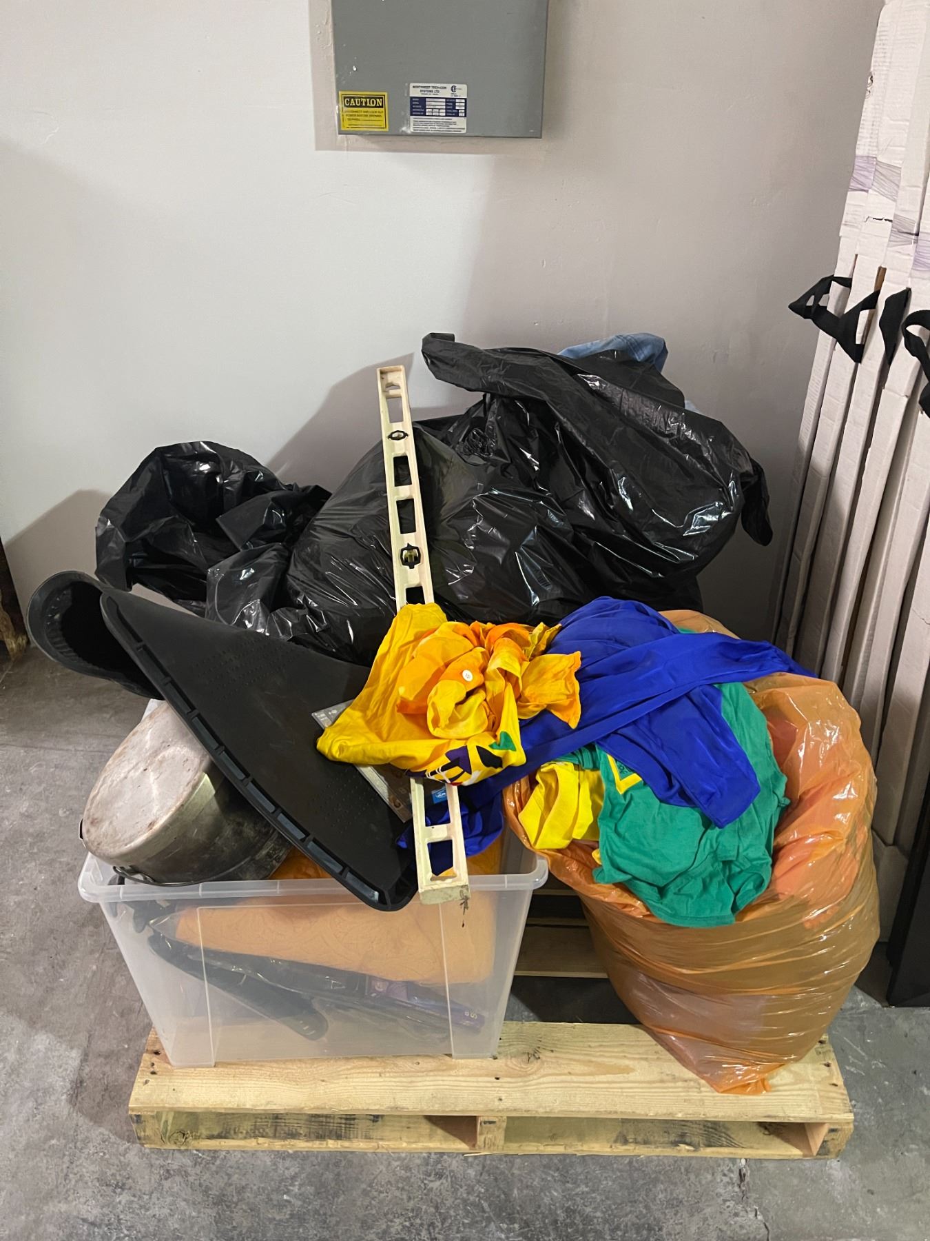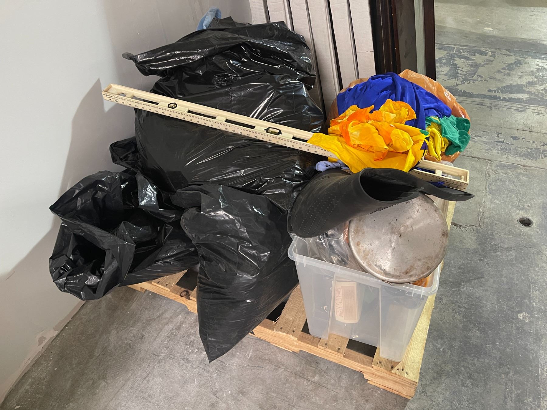 Pallet lot - Misc bags of clothes - floor mat - level - cooking pot - misc items