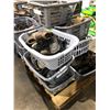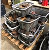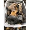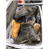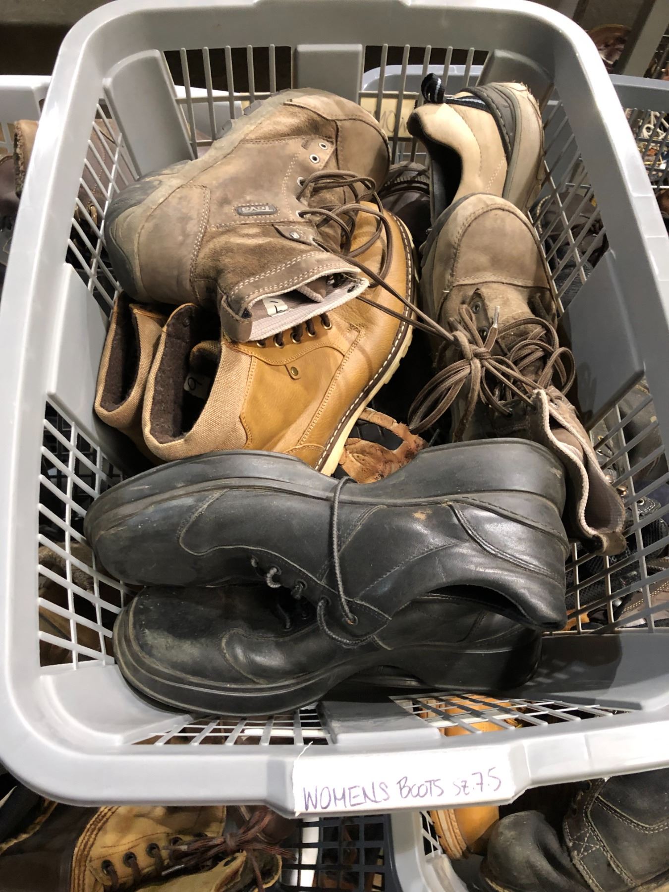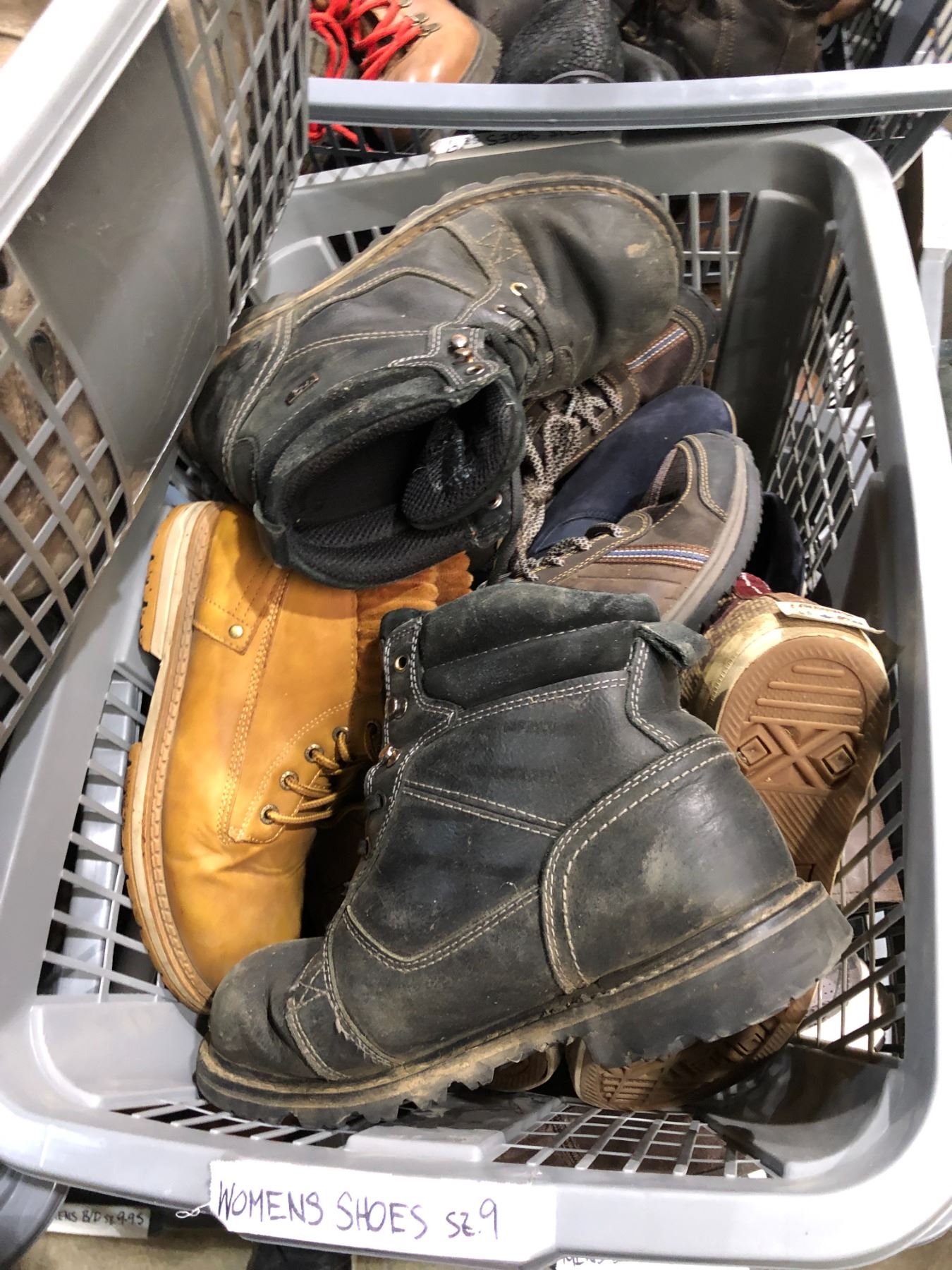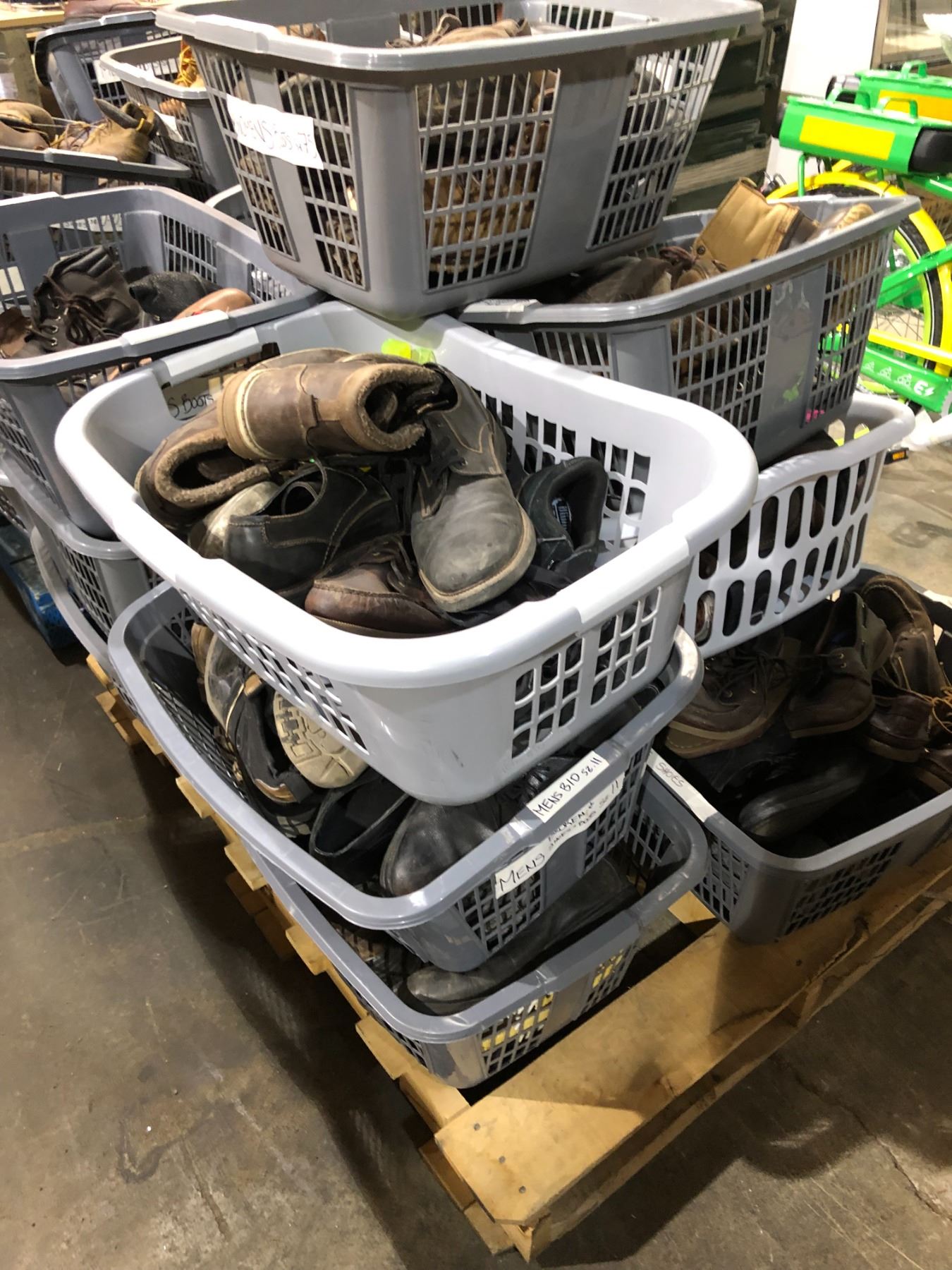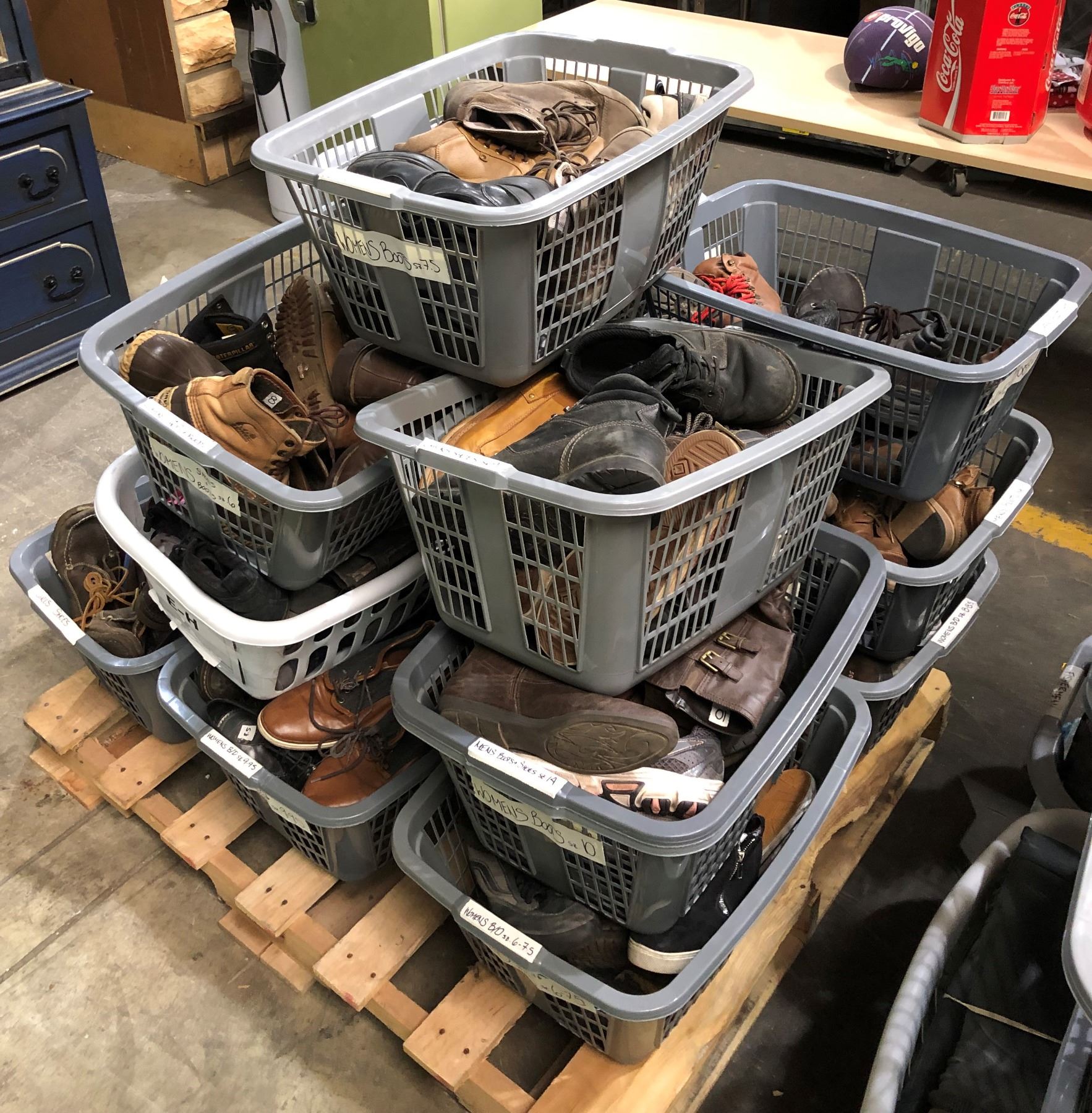 Pallet lot of 14 gray laundry baskets filled w/ assorted boots & shoes from the show