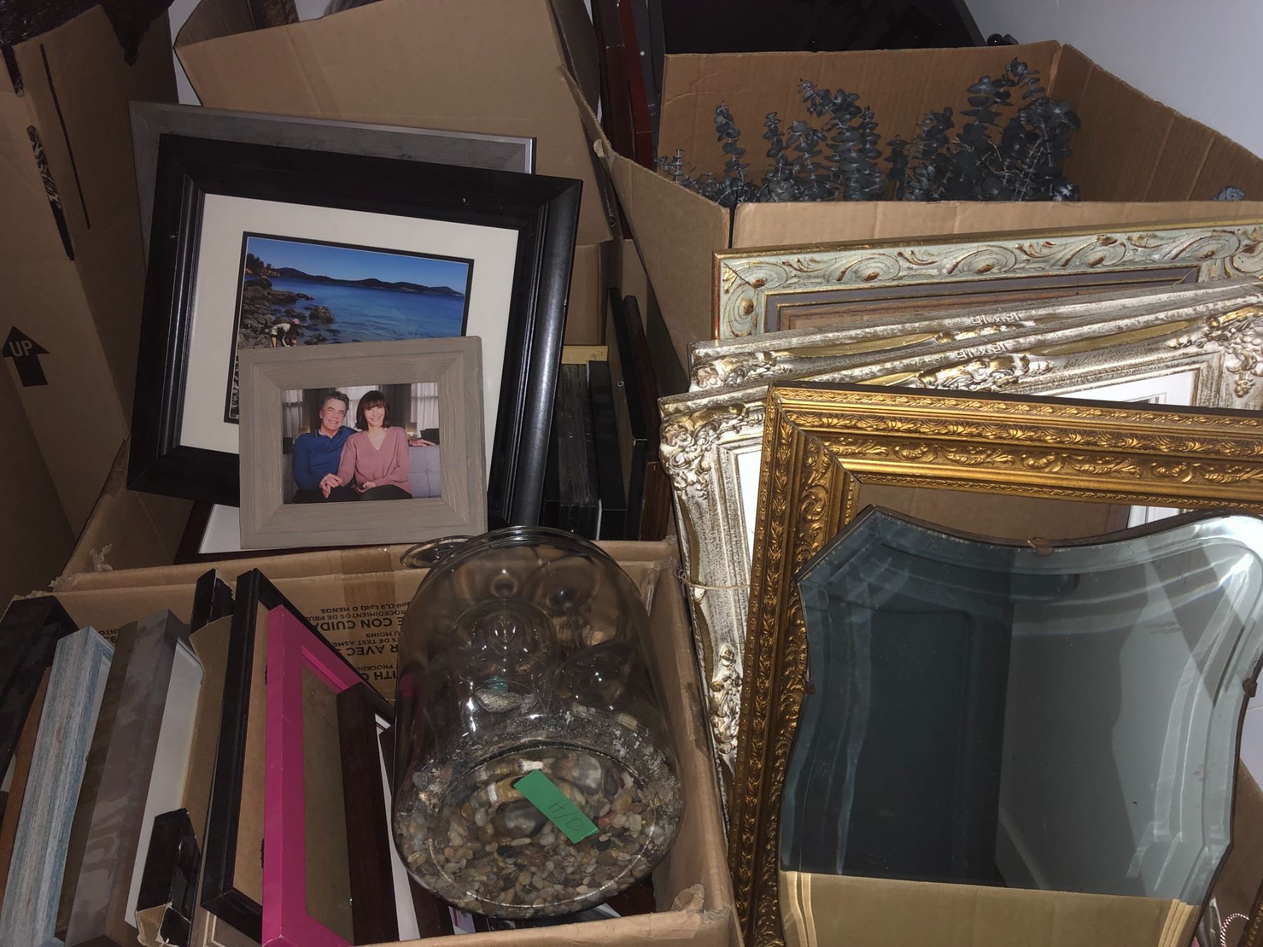 Pallet lot of approx. 8 boxes of assorted pictures/ picture frames/ artificial plants/ misc. household decorative items etc.,