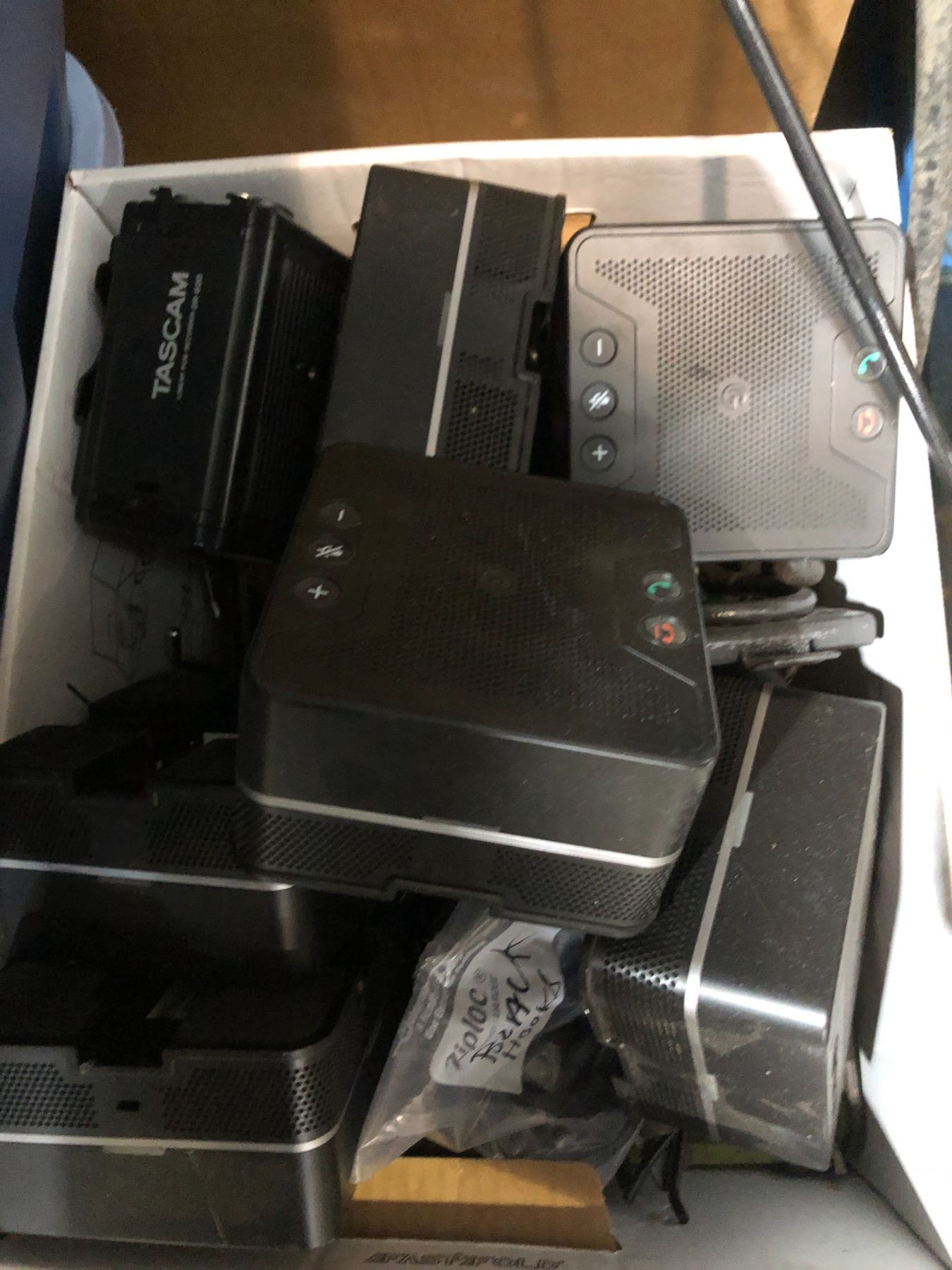 Pallet lot of assorted camping utilities & misc items - includes LED halogen track lights / 4 wheel dolly / chairs / Google hangouts meet speaker mics etc