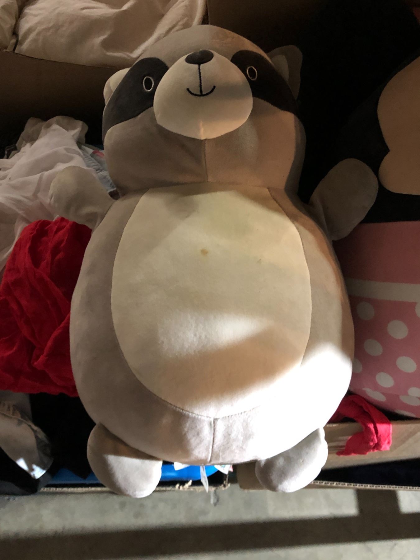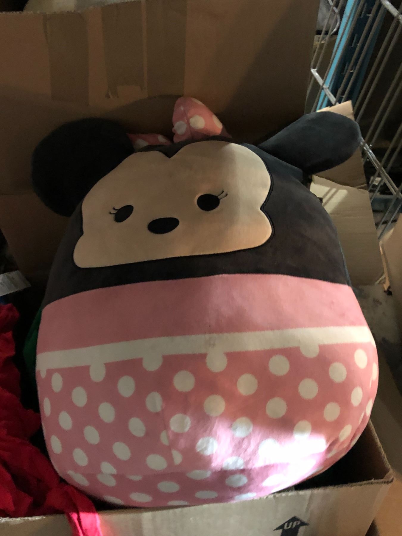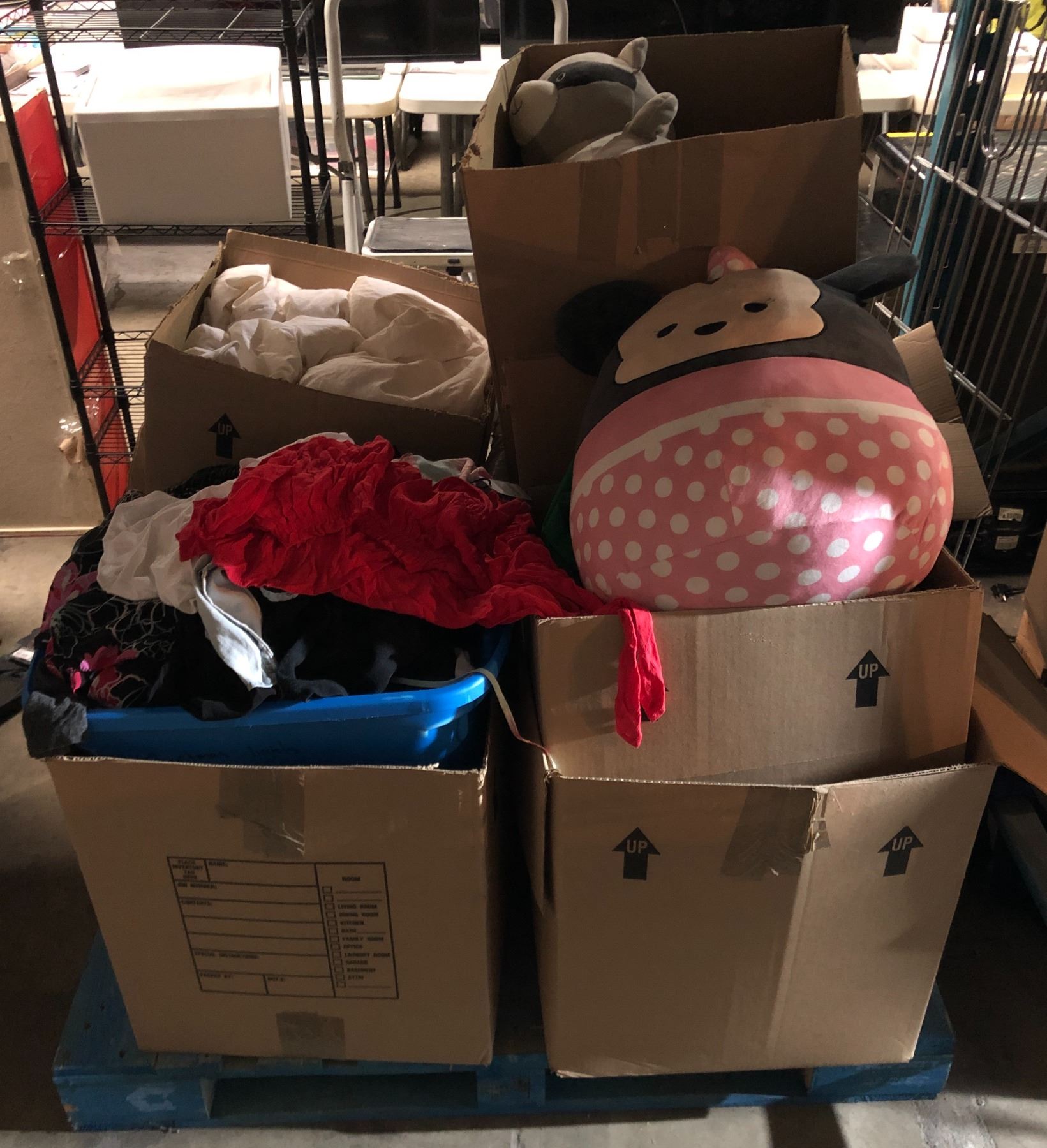 Pallet lot of assorted clothes & misc- includes bedding / shirts / Disney squishmallows etc