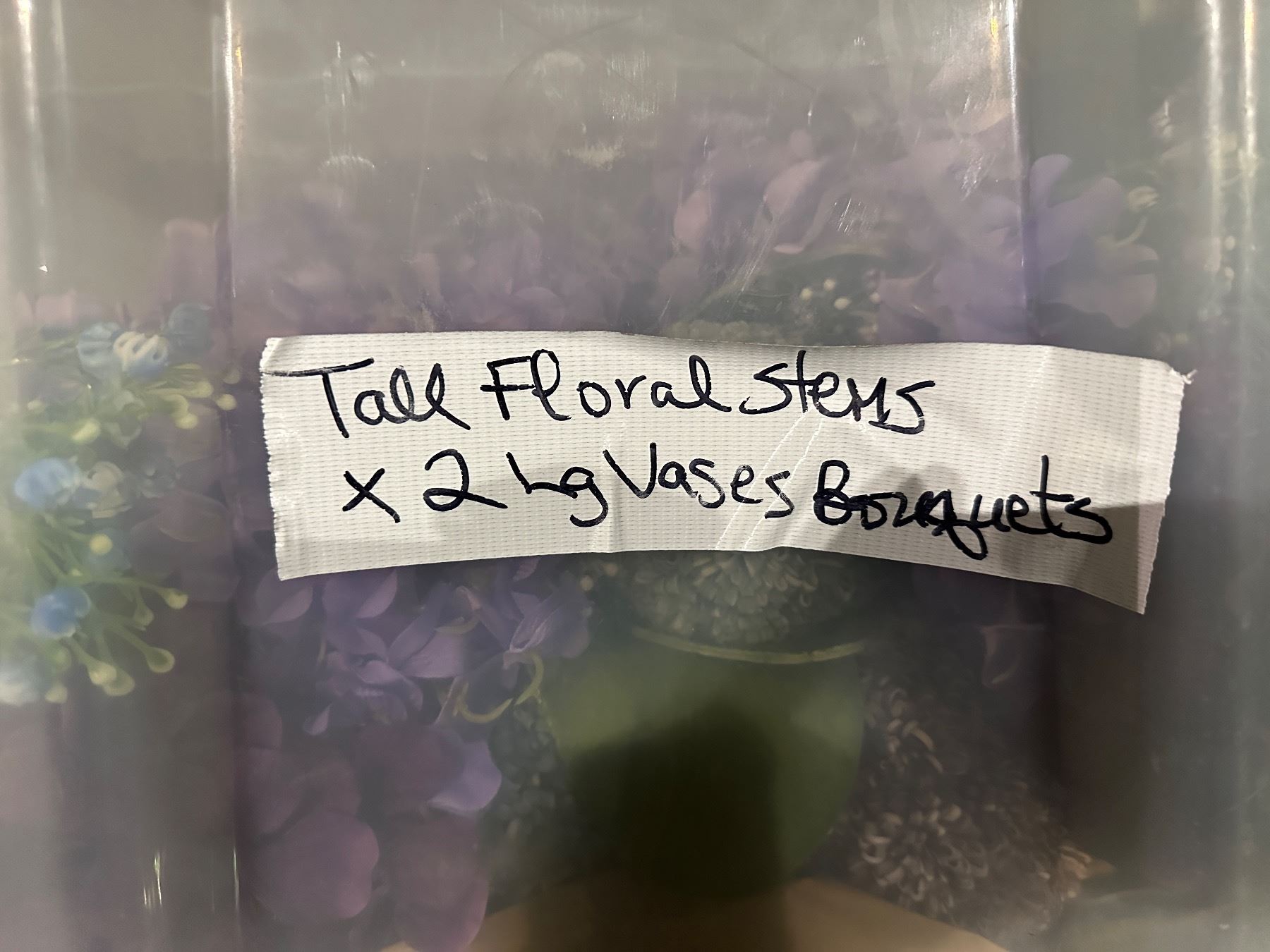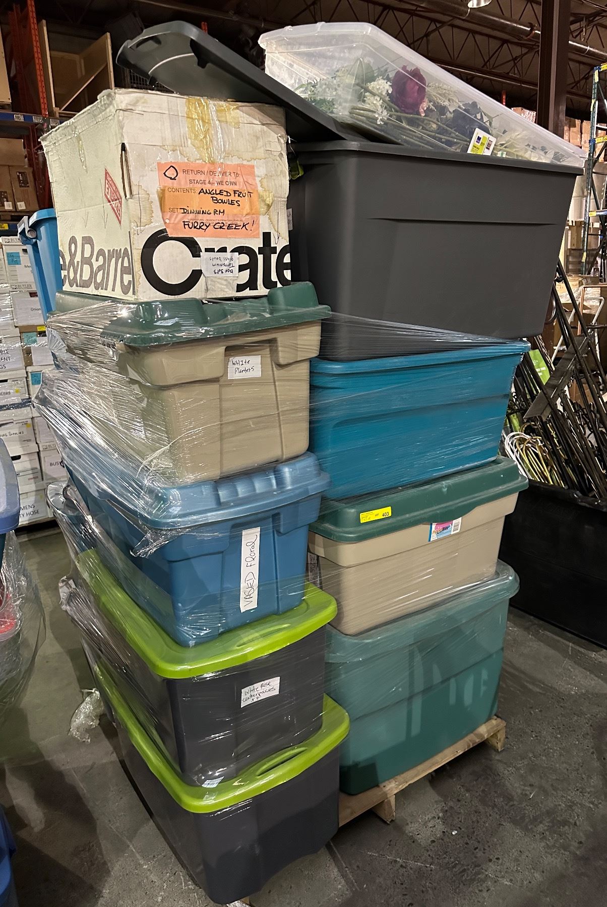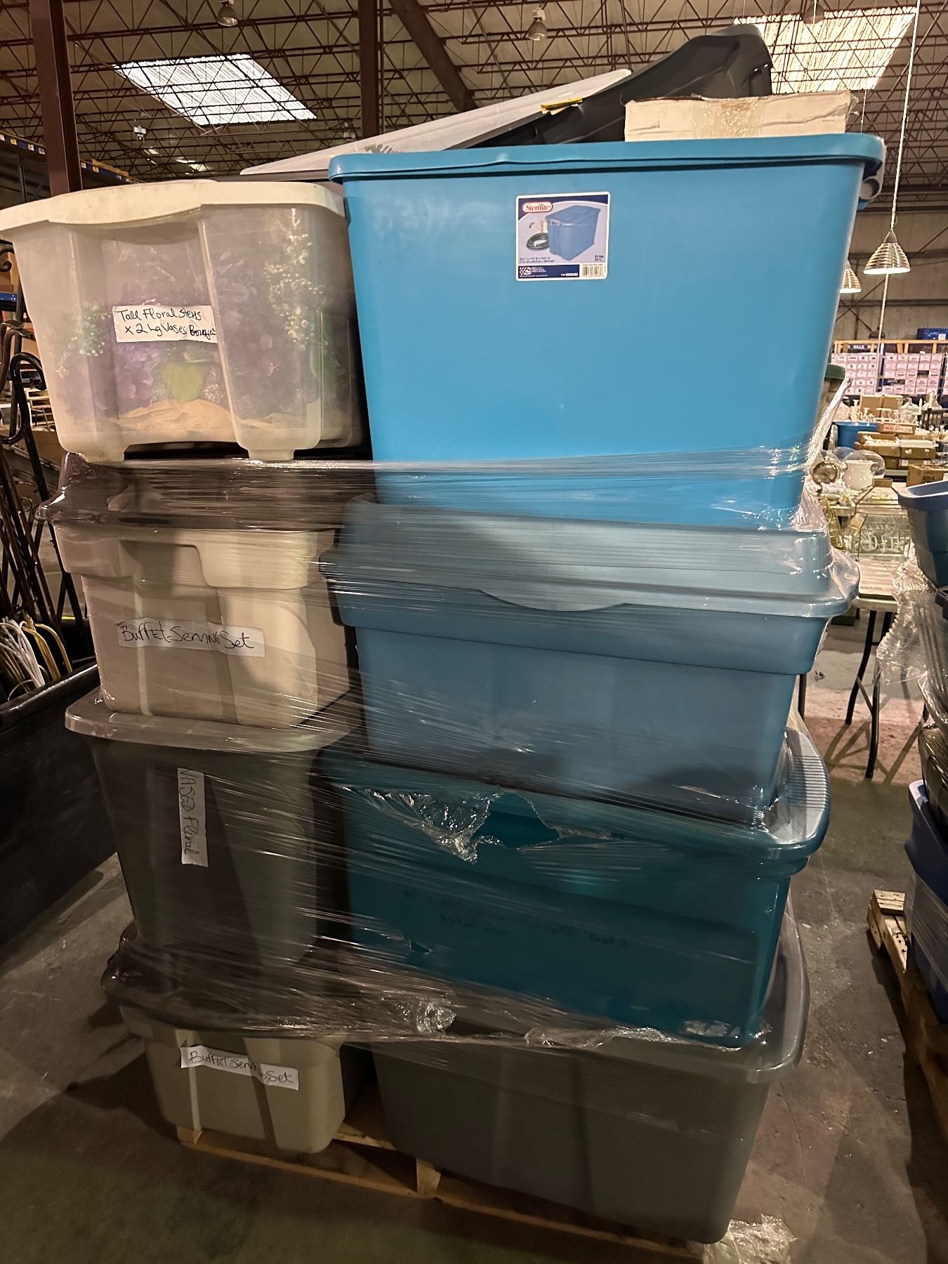 Pallet lot of misc. including - rose centrepiece, white planters, vase floral, storage bins, etc...
