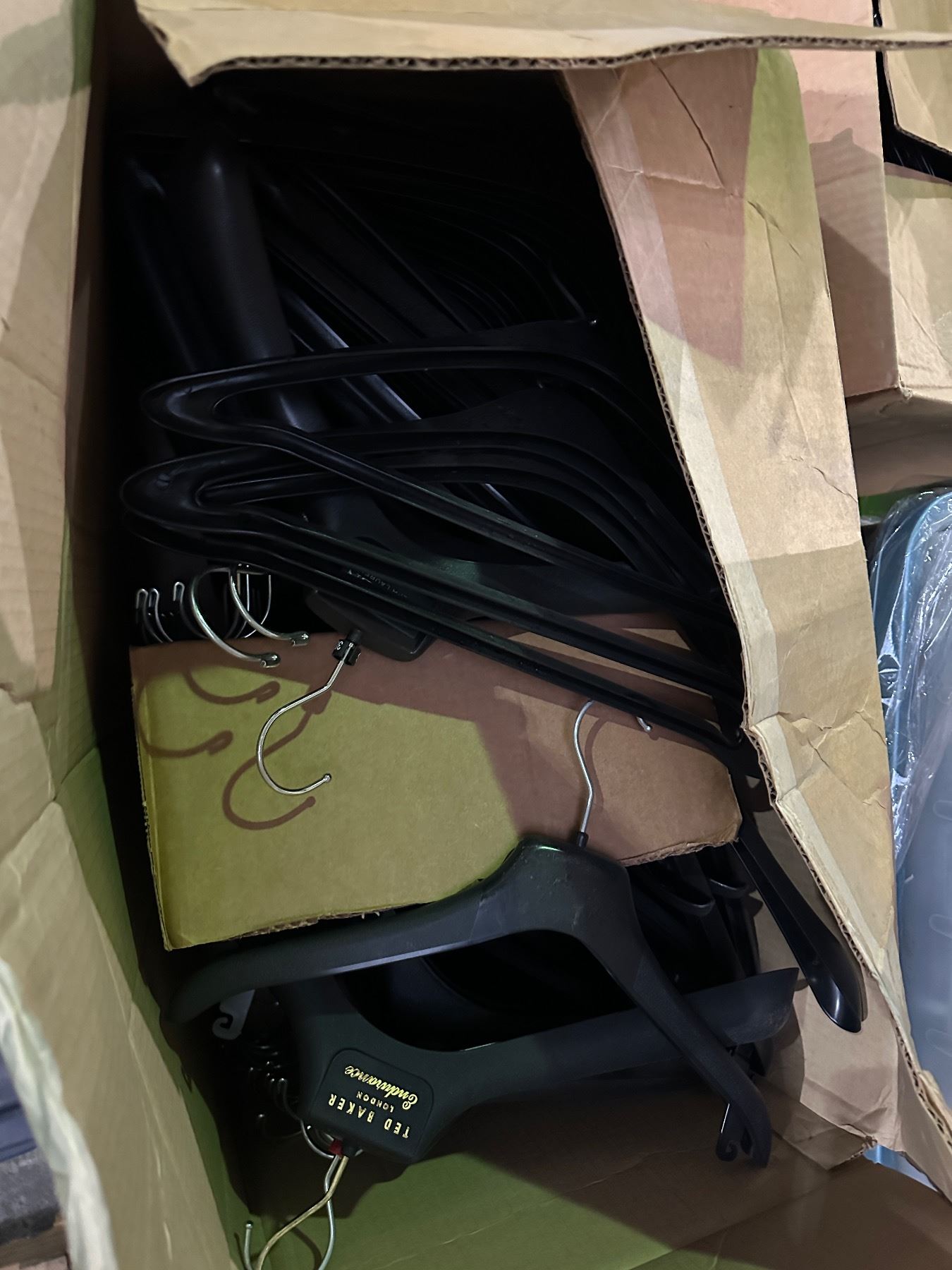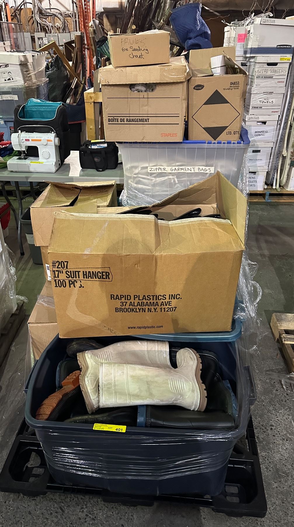 Pallet lot of misc. including - zipper garment bags, boot/shoes, suit hangers, hangers, picture fram