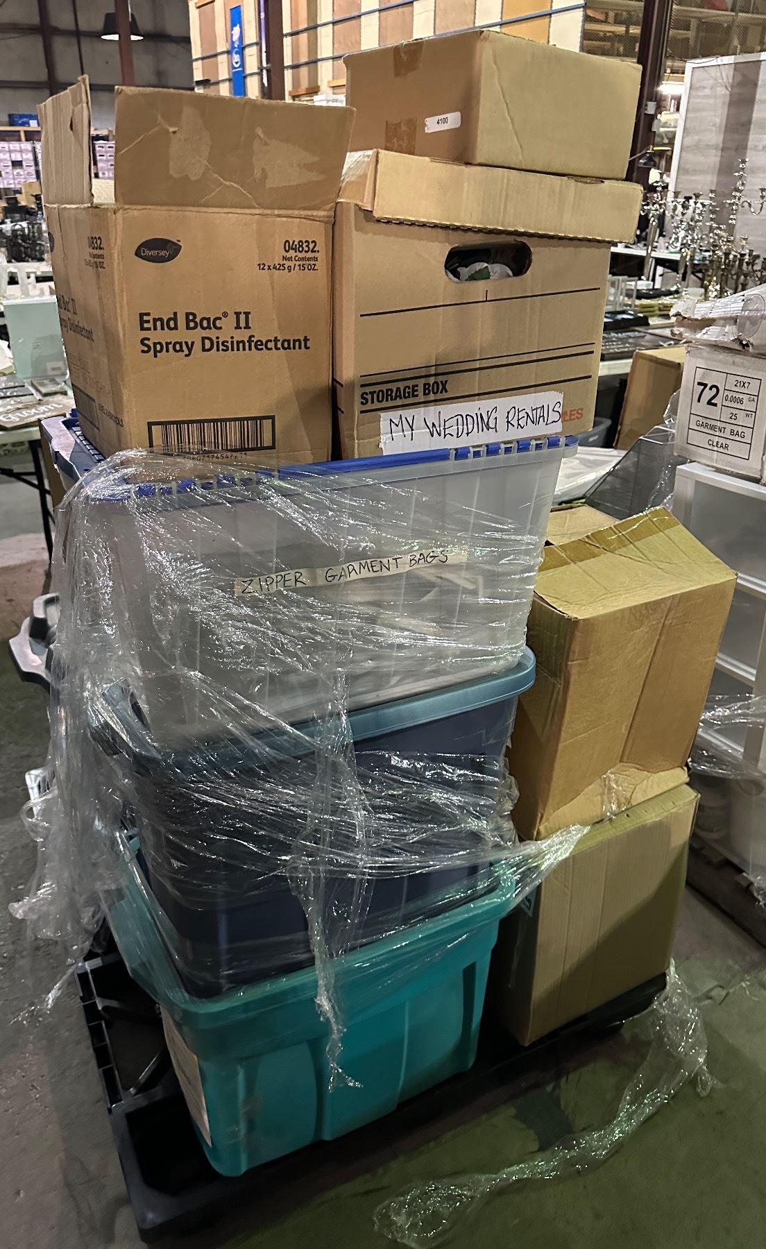 Pallet lot of misc. including - zipper garment bags, boot/shoes, suit hangers, hangers, picture frames, fake flowers, spray disinfectant, etc...
