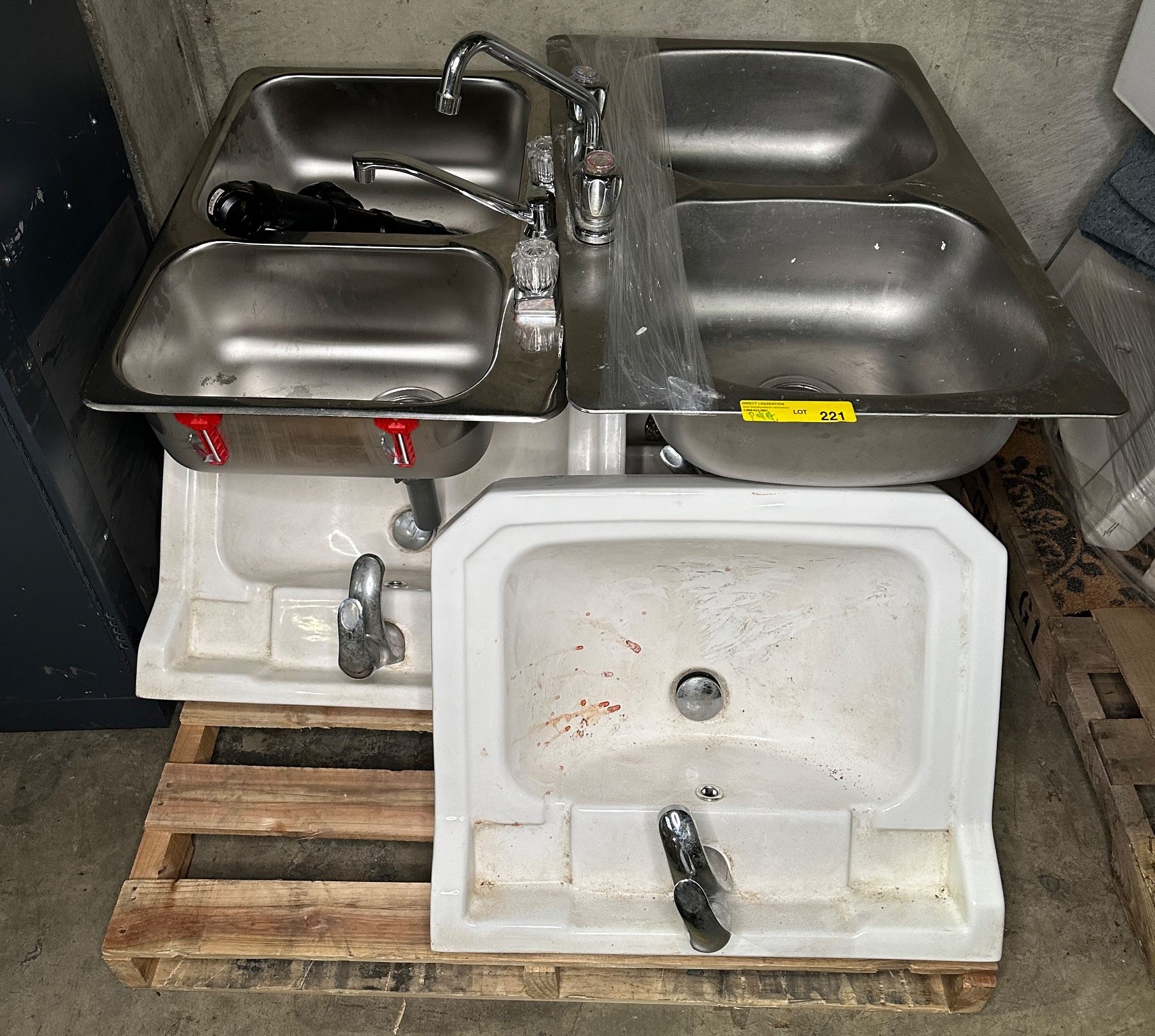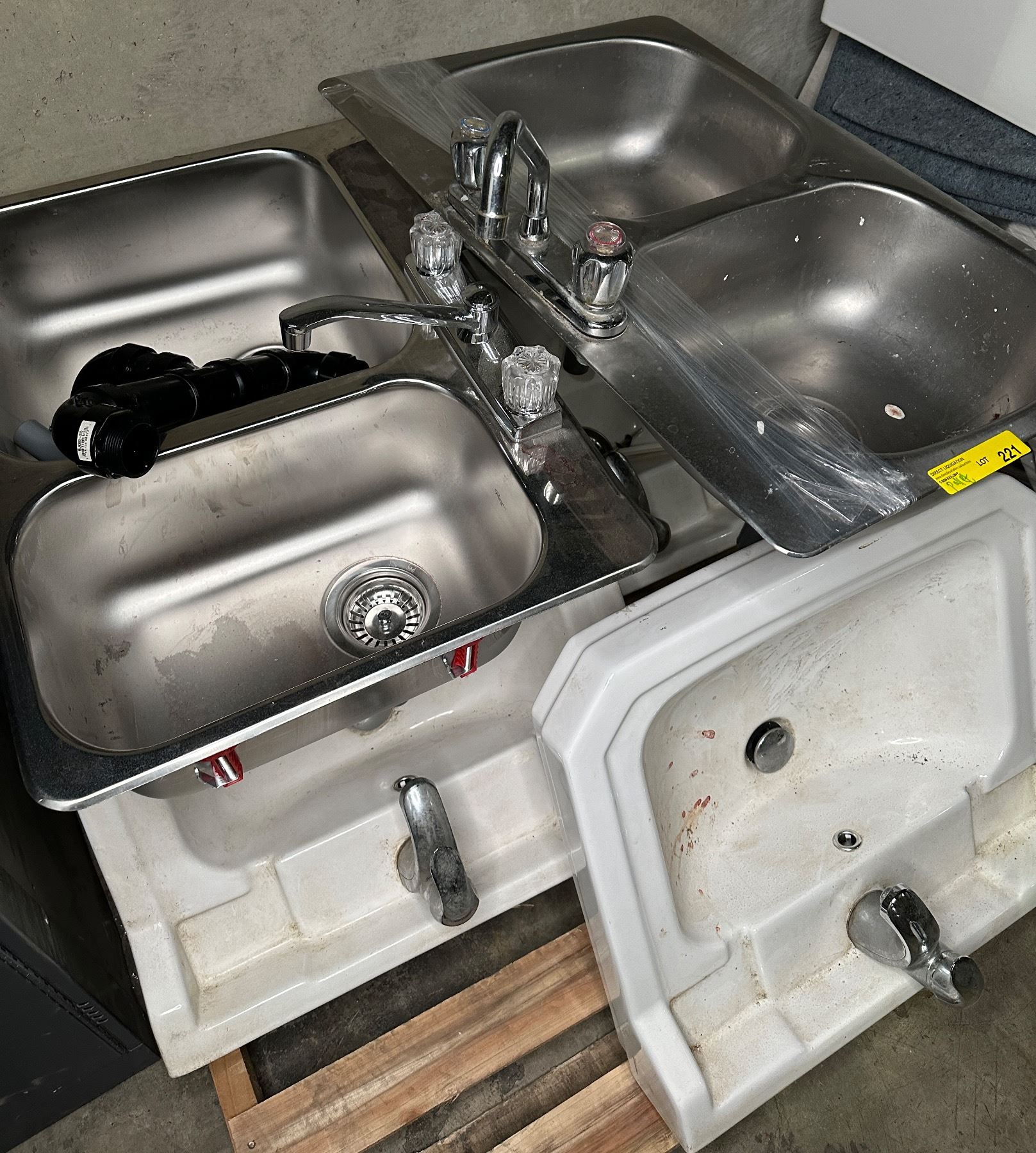 Pallet lot of misc items including - approx 5 commercial grade sinks (4 single & 2 double sinks)