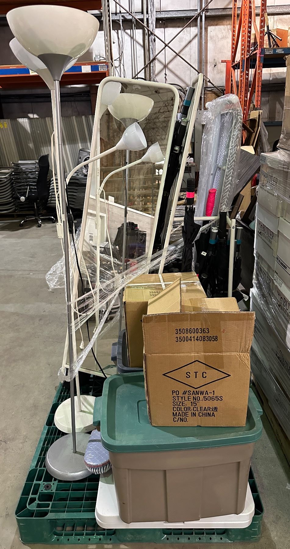 Pallet lot of misc. items including - golf bag, hangers, stand up mirrors, 2 stand up lamps, umbrell