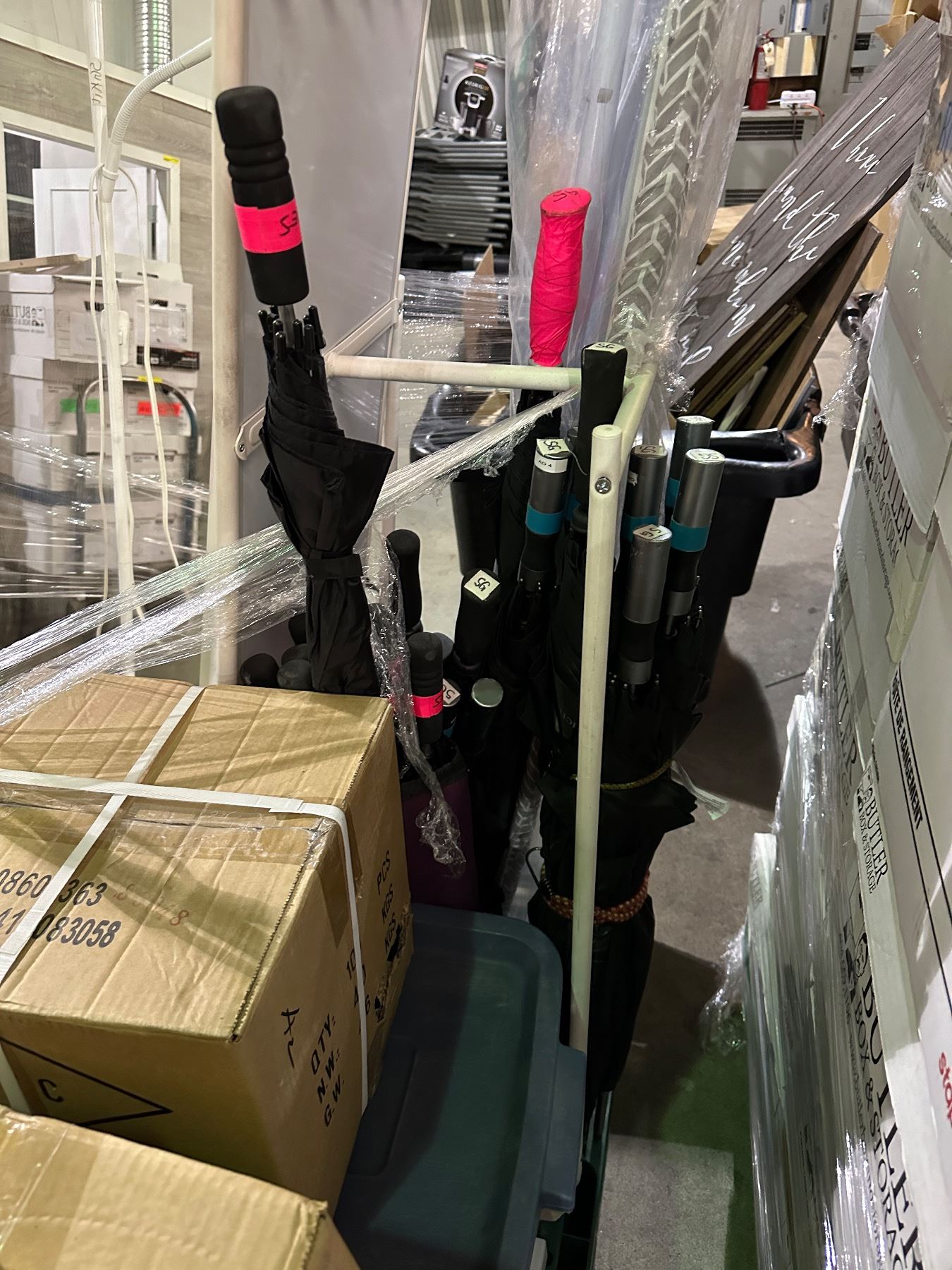 Pallet lot of misc. items including - hangers, stand up mirrors, 2 stand up lamps, umbrellas, iron board, table, garment bags, etc...