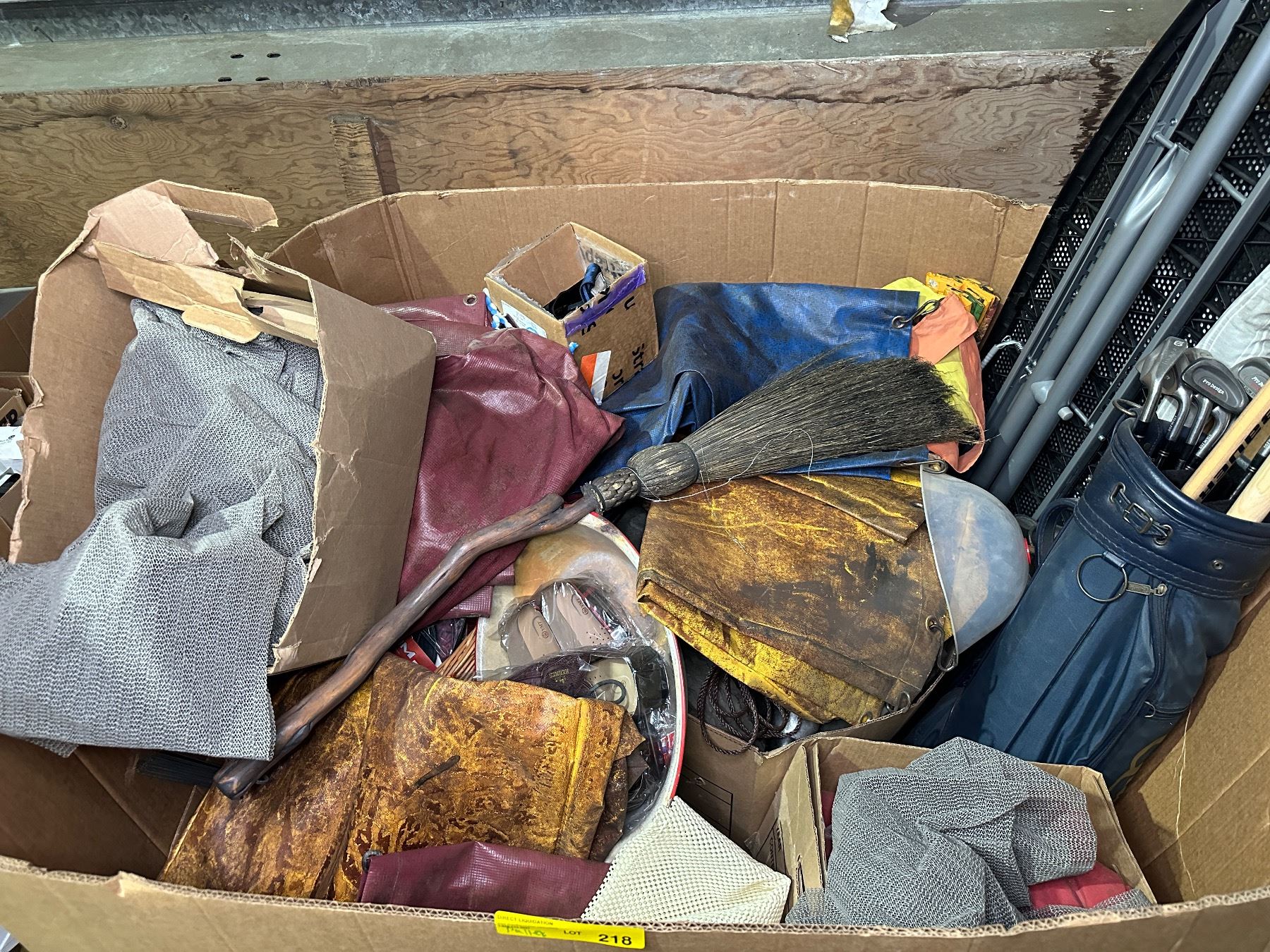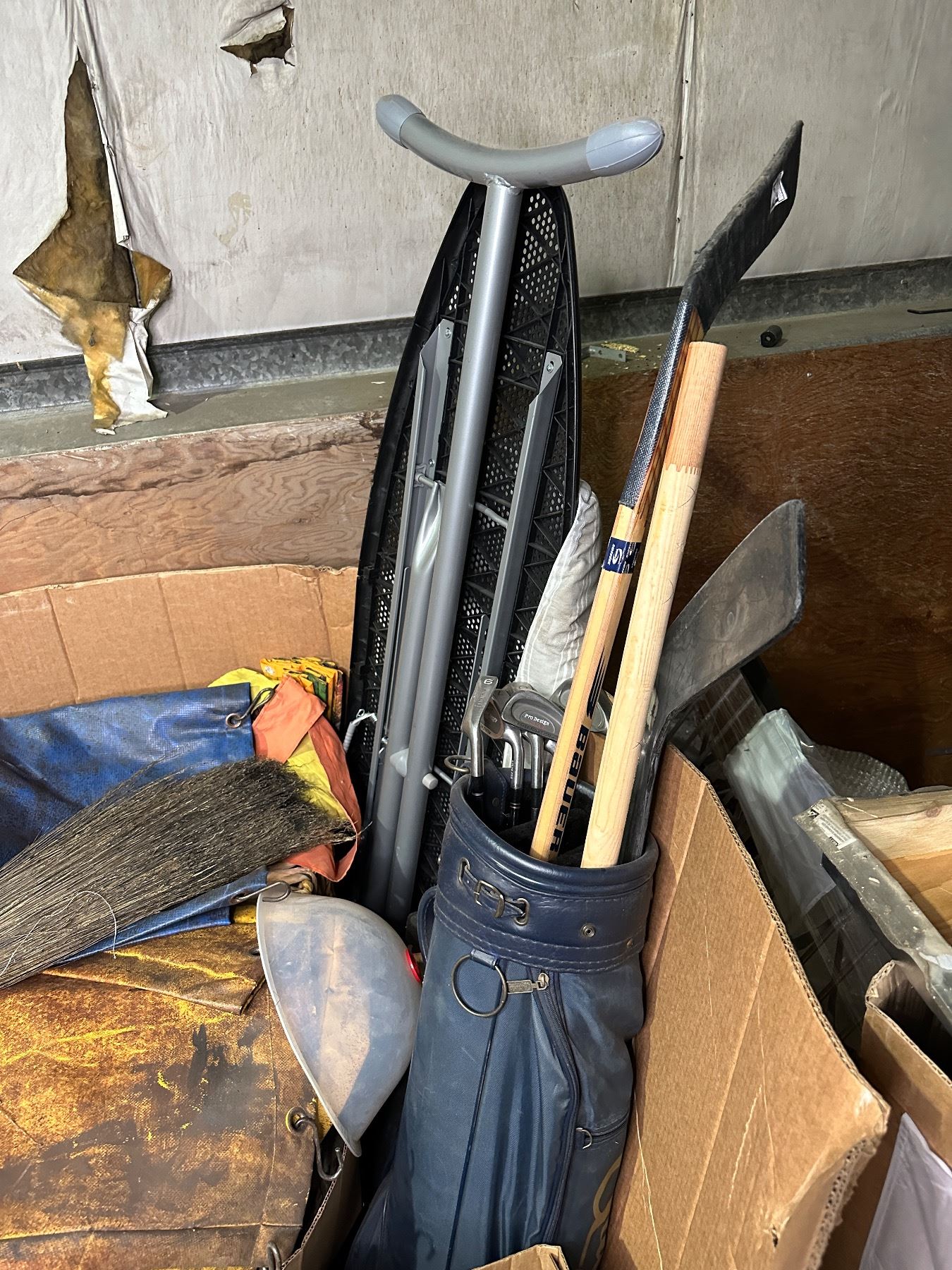 Pallet lot of misc items including - iron board, broom, tarp, iron board, hockey stick, under carpet non-slip, vintage golf bag w/various clubs, etc...